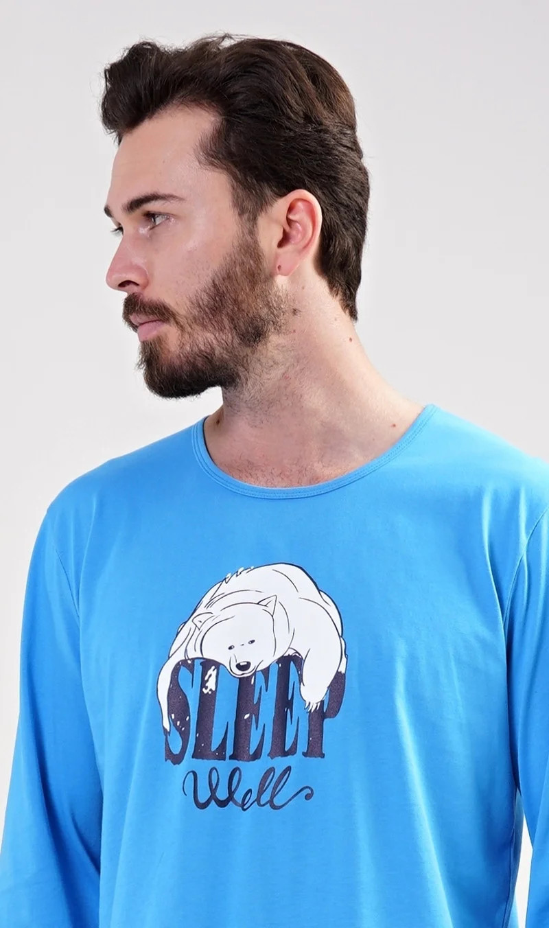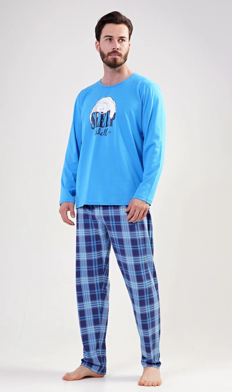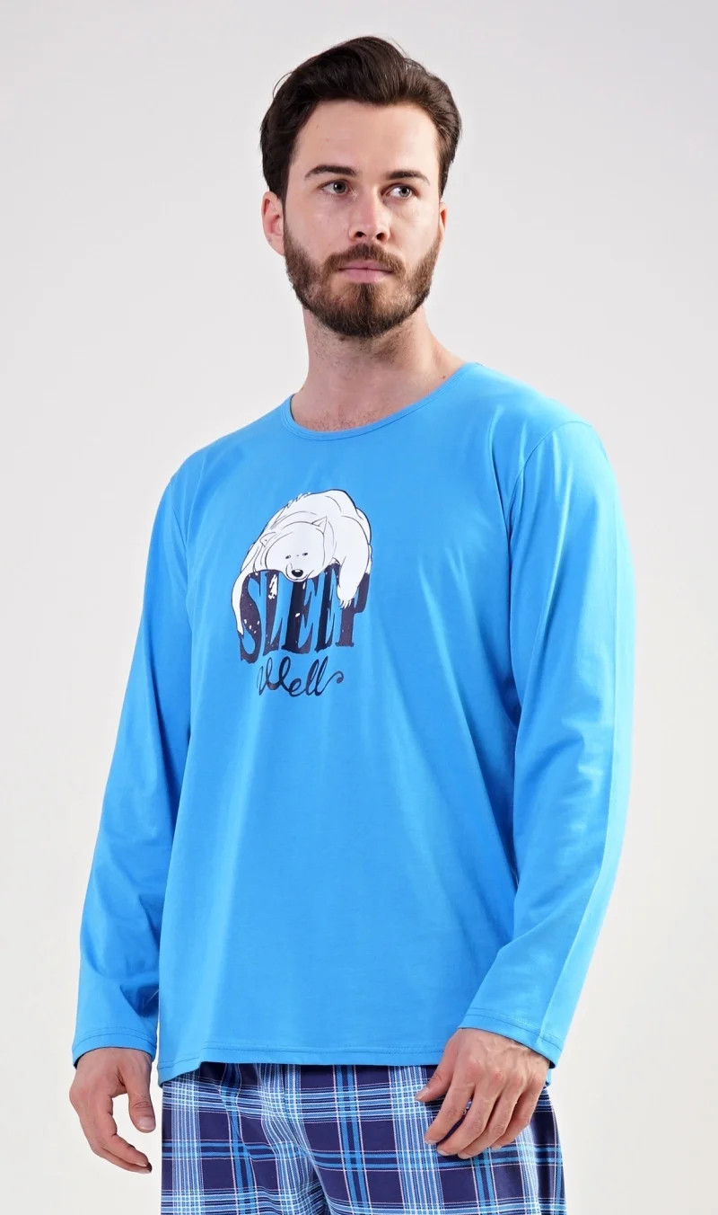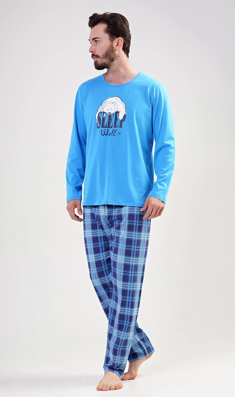 Pánské bavlněné pyžamo dlouhé Sleep well. Pánské pyžamo se skládá z trika s dlouhým rukávem a dlouhých kalhot. Na tričku je nápis Sleep well, na kterém spí roztomilý lední mědvěd. Kalhoty jsou kostkované, mají gumu a šňůrku na stažení. Použitý materiál s podílem bavlny 100% je příjemný a poddajný na dotek.