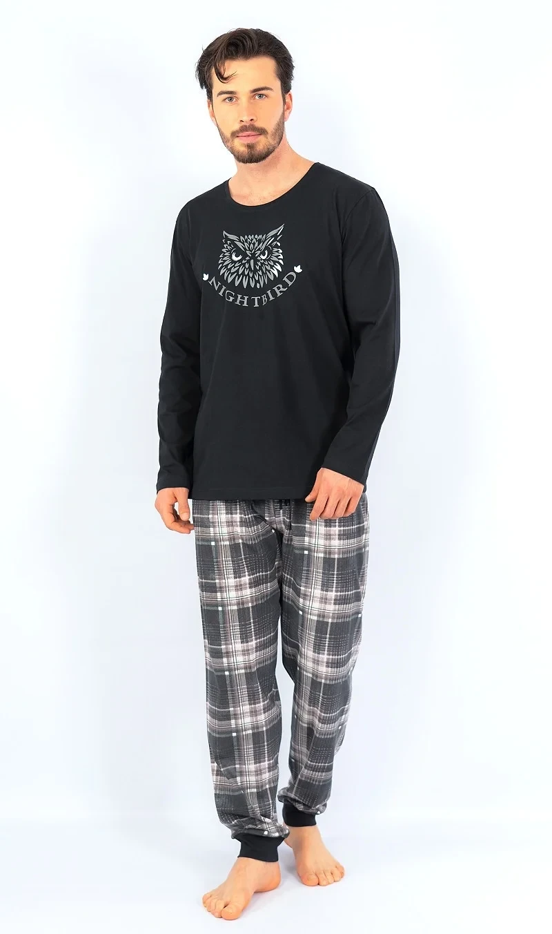 Pánské bavlněné pyžamo dlouhé Sova. Pánské pyžamo se skládá z trika s dlouhým rukávem a dlouhých kalhot. Na jednobarevném triku je obrázek sovy, pod kterou je nápis Nightbird. Kalhoty jsou kostkované, mají gumu a šňůrku na stažení. Nemají kapsy. Použitý materiál s podílem bavlny 100% je příjemný a poddajný na dotek.