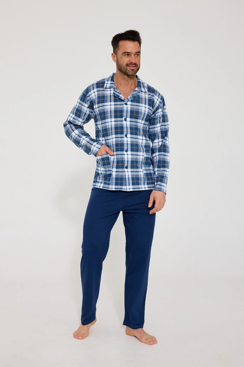 Piżama męska DR 114 BIG J/25 to elegancka propozycja dla panów, którzy cenią klasyczny styl i komfort użytkowania. Koszula z długim rękawem, rozpinana na guziki, wykończona tradycyjnym kołnierzykiem oraz wyposażona w praktyczne kieszenie na wysokości bioder. Do zestawu dołączone są jednolite, długie spodnie z prostą nogawką, które zapewniają wygodę i swobodę ruchów. Całość wykonana z wysokogatunkowej, 100% bawełny, idealnej dla wymagającej skóry. Piżama pakowana w eleganckie pudełko – świetna także na prezent.