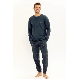 Pánské pyžamo s dlouhými rukávy, jednobarevné, s jemným potiskem na hrudi. doplněné dlouhými vzorovanými kalhotami se šňůrkami a kapsami.