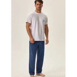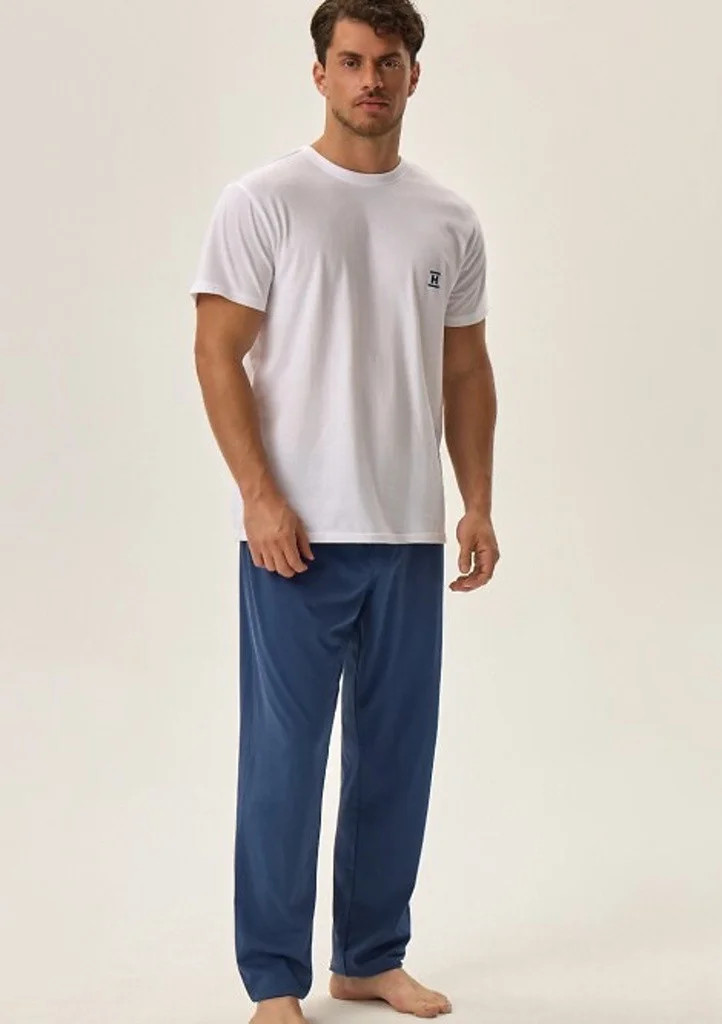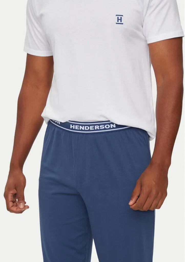 Pánské pyžamo značky Henderson. Pyžamo se skládá z trička s krátkým rukávem. Okolo krku je kulatý výstřih s pružným lemem a na levé straně je menší písmeno H. Kalhoty jsou volnější, v pase jsou do pružné gumy na které je po celém odvodu nápis Henderson. Nohavice jsou ukončené volně a jsou jednobarevné.