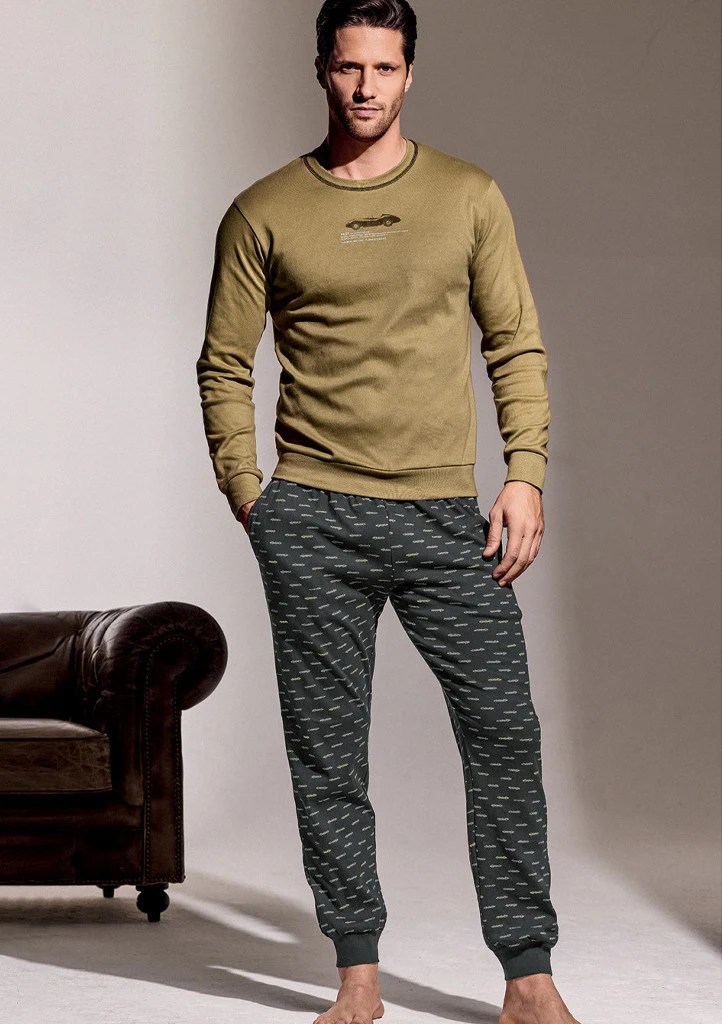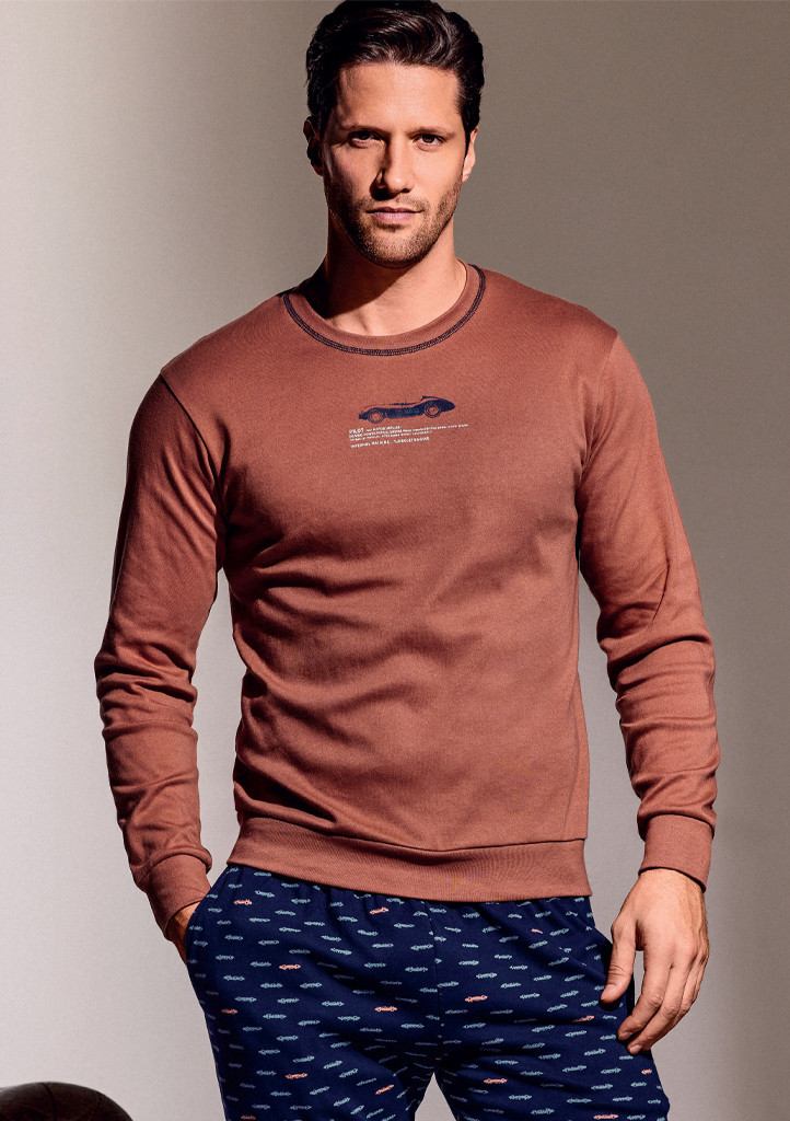 Stylové a pohodlné pánské pyžamo od značky Infiore potěší každého muže, který má rád kombinaci komfortu a moderního vzhledu. Horní díl v teplé hnědé barvě má dlouhé rukávy a decentní potisk s motivem auta na hrudi. Kalhoty v tmavě modrém odstínu zdobí drobný vzor s autíčky a jsou zakončené pružnou manžetou, která zajišťuje pohodlné nošení. Pyžamo je vyrobeno z měkké a prodyšné bavlny, která poskytuje maximální komfort po celou noc. Ideální volba pro chladnější období i pohodlný domácí odpočinek. Pyžamo je baleno v praktické krabičce, takže se skvěle hodí i jako dárek.