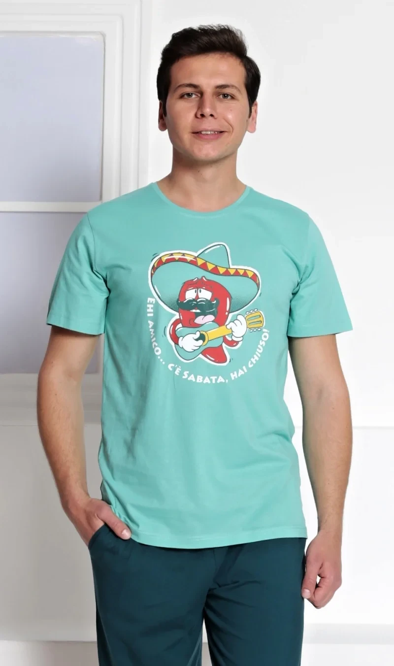 Pánské pyžamo kapri Mexiko. Pánské pyžamo kapri se skládá z trička s krátkým rukávem a tříčtvrtečních kalhot. Na jednobarevném tričku je chilli paprička s obrovským sombrérem a mexickým nápisem hrající na kytaru. Výrazné tričko vhodně doplňuují jednobarevné kalhoty. Použitý materiál je jemný a podddajný na dotek. Pyžamo je vhodné na denní nošení.