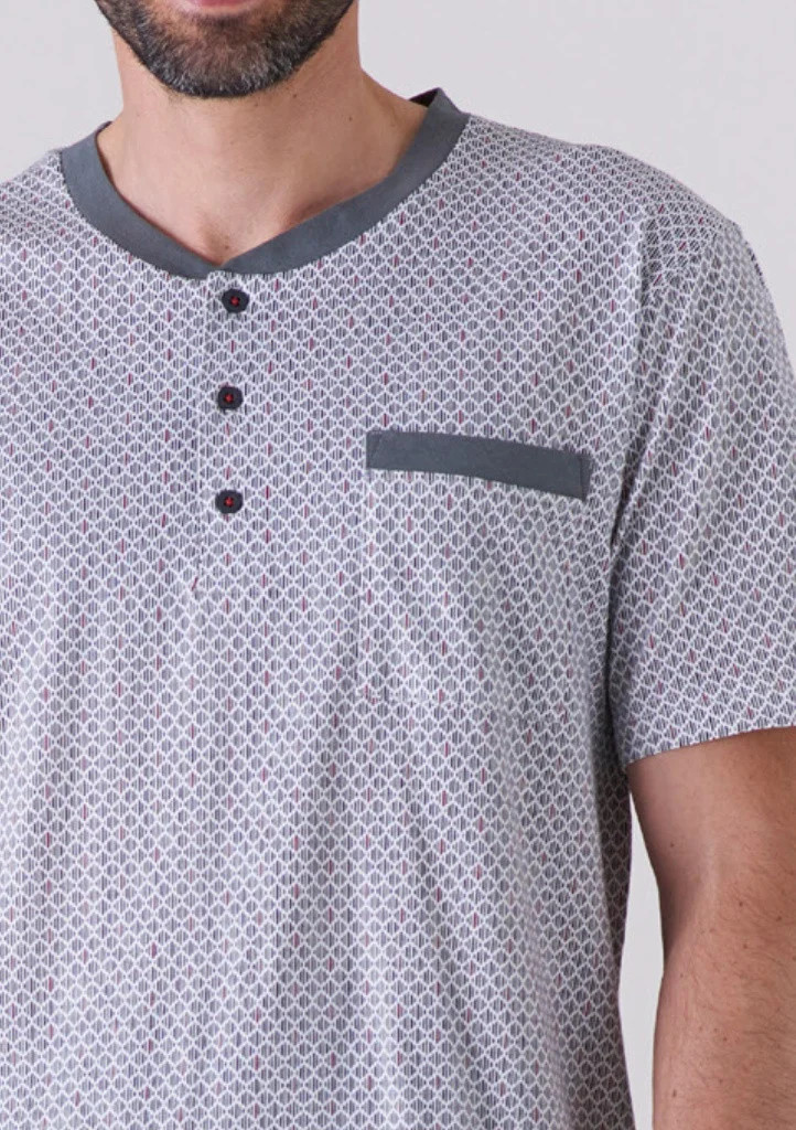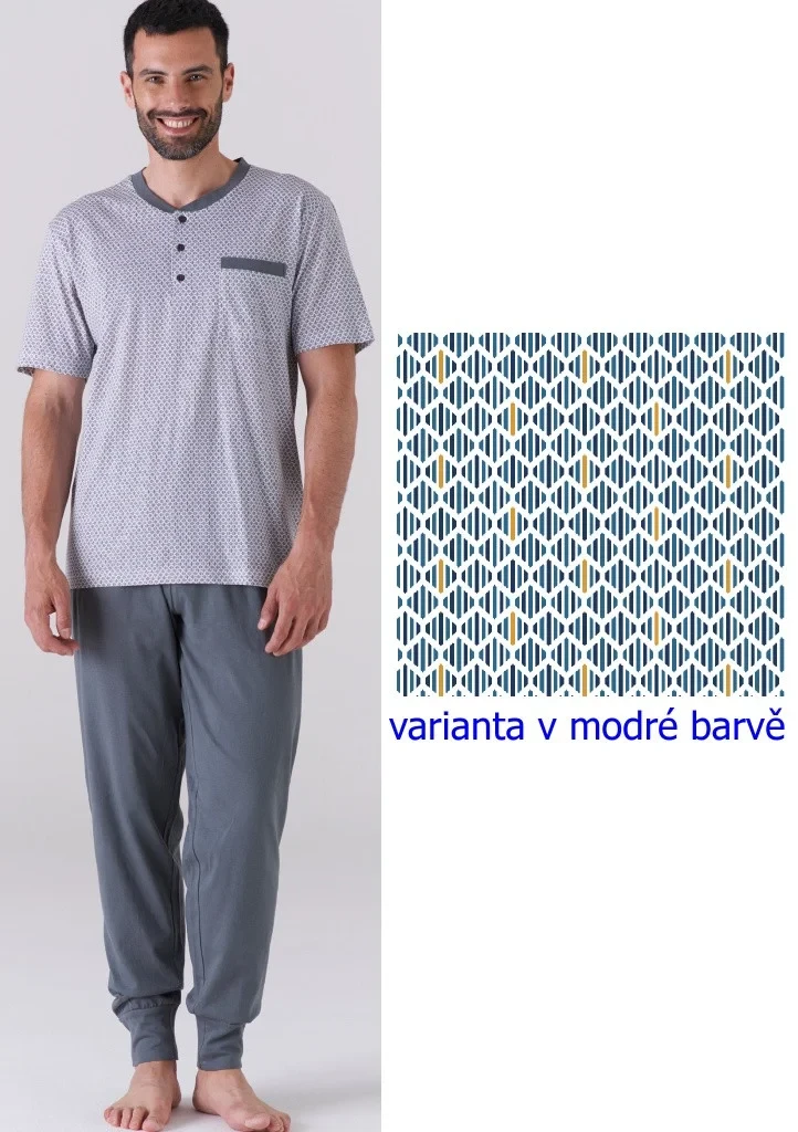 Pánské bavlněné pyžamo italské značky Karelpiu. Pyžamo je ze 100% bavlny, velmi příjemné a pohodlné i v letních měsících. Tričko má krátký rukáv, kulatý výstřih a légu se třemi knoflíky. Na levé přední straně je našitá kapsička. Volné kalhoty mají v pase pohodlnou pružnou gumu, nohavice jsou ukončeny širokou mnažetou.