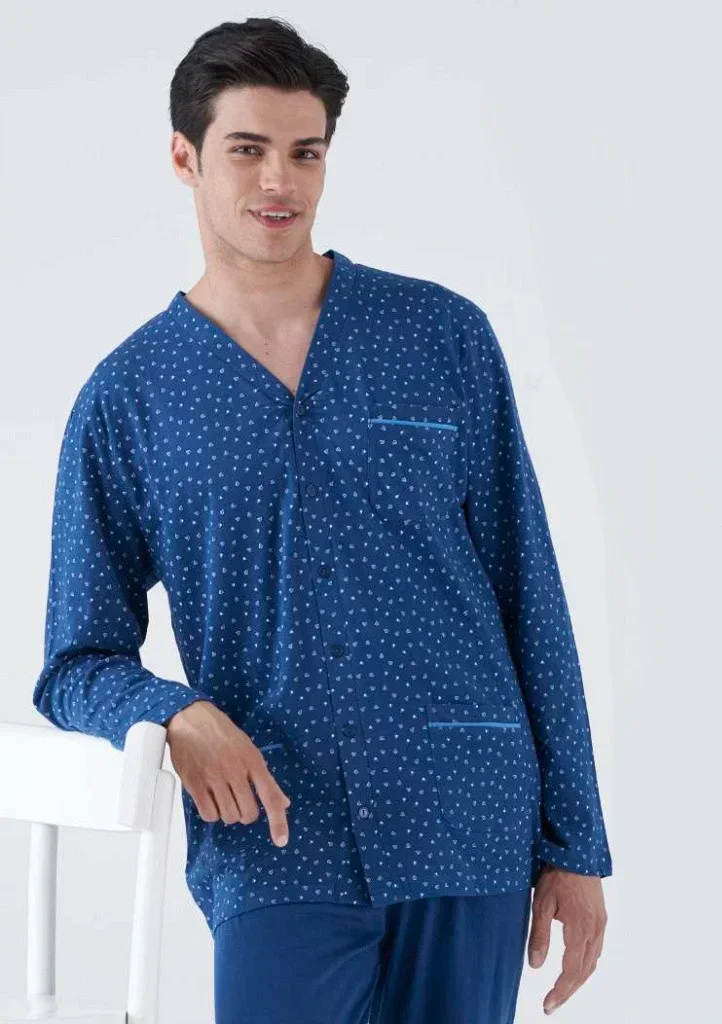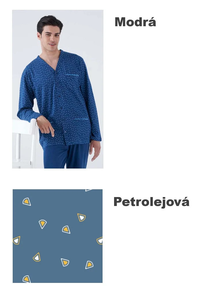 Pánské pyžamo značky Karelpiu. Pyžamo se skládá z kabátku, který je celopropínací na knoflíky, výstřih je do "V". Na levé straně je našitá kapsička a kapsičky jsou našité i ve spodní části. Kalhoty jsou v pase do pružné obšité gumy. Pyžamo nemá žádné lemy a je pohodlné na nošení, je ušité z příjemné bavlny.