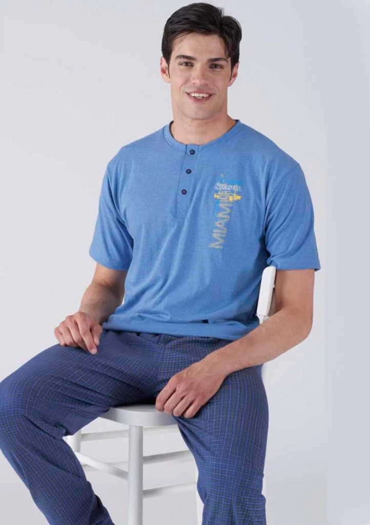 Pánské bavlněné pyžamo italské značky Karelpiu. Pyžamo ze 100% bavlny, je velmi příjemné a pohodlné. Tričko má kulatý výstřih a légu se třemi knoflíky. Na levé přední straně je našitá kapsička. Tričko má krátký rukáv. Kalhoty mají v pase pohodlnou pružnou gumu, nohavice jsou ukončeny širokou mnažetou.