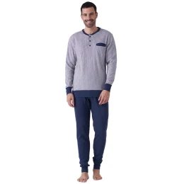 Pánské bavlněné pyžamo italské značky Karelpiu. Pyžamo je ze 100% bavlny, velmi příjemné a pohodlné. Tričko má dlouhý rukáv, kulatý výstřih a légu se třemi knoflíky. Na levé přední straně je našitá kapsička. Volné kalhoty mají v pase pohodlnou pružnou gumu, nohavice jsou ukončeny širokou mnažetou.