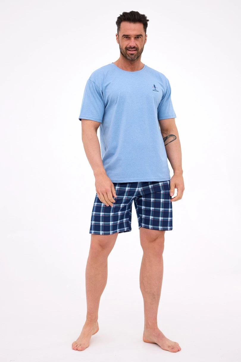 Pánské pyžamo KR 326/309 Sequoia 2 je dokonalou kombinací pohodlí a klasického stylu. Je vyrobeno z vysoce kvalitní bavlny, je prodyšné a pohodlné po celou noc. Tričko s krátkým rukávem a kulatým výstřihem zdobí na hrudi decentní potisk. Krátké šortky ve stylovém kostkovaném vzoru mají elastický pas lemovaný bavlnou, který zaručuje volnost pohybu a perfektní přizpůsobení. Jedná se o praktickou soupravu na léto a teplé noci, která v sobě spojuje jednoduchost, pohodlí a nadčasový design.
