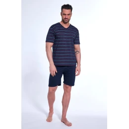 Pánské pyžamo z kvalitní měkké bavlny. Pruhované tričko s krátkým rukávem a výstřihem, krátké jednotné šortky, krabice.