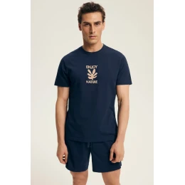 Piżama męska LEGEND 43462 AW25 to stylowe i wygodne rozwiązanie dla mężczyzn ceniących naturalne materiały i modny wygląd. Wykonana w 100% z oddychającej bawełny, zapewnia pełen komfort noszenia zarówno w nocy, jak i w domowym relaksie. T-shirt z krótkim rękawem z nadrukiem „ENJOY NATURE” oraz krótkie spodenki z elastyczną talią i sznurkiem dopasowują się do sylwetki, gwarantując swobodę ruchu. Idealna propozycja na cieplejsze noce oraz jako wygodny homewear.