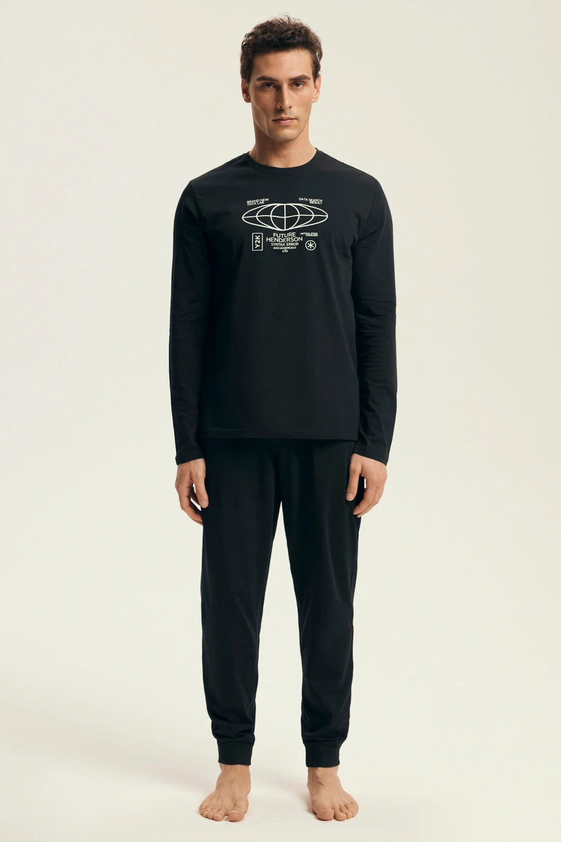 Přeneste se do budoucnosti s moderním pánským pyžamem LOGER 43469 AW25 od značky Henderson. Černá kombinace a futuristický potisk na tričku vytvářejí jedinečnou vesmírnou atmosféru. Je vyrobeno ze 100% kvalitní prodyšné bavlny a poskytuje pohodlí při spánku i nošení. Kalhoty se stahovací šňůrkou a elastický pas s natištěným logem "Future Henderson" zaručují dokonalé přizpůsobení. Ideální pro muže, kteří ocení originální styl a funkčnost na každý den.