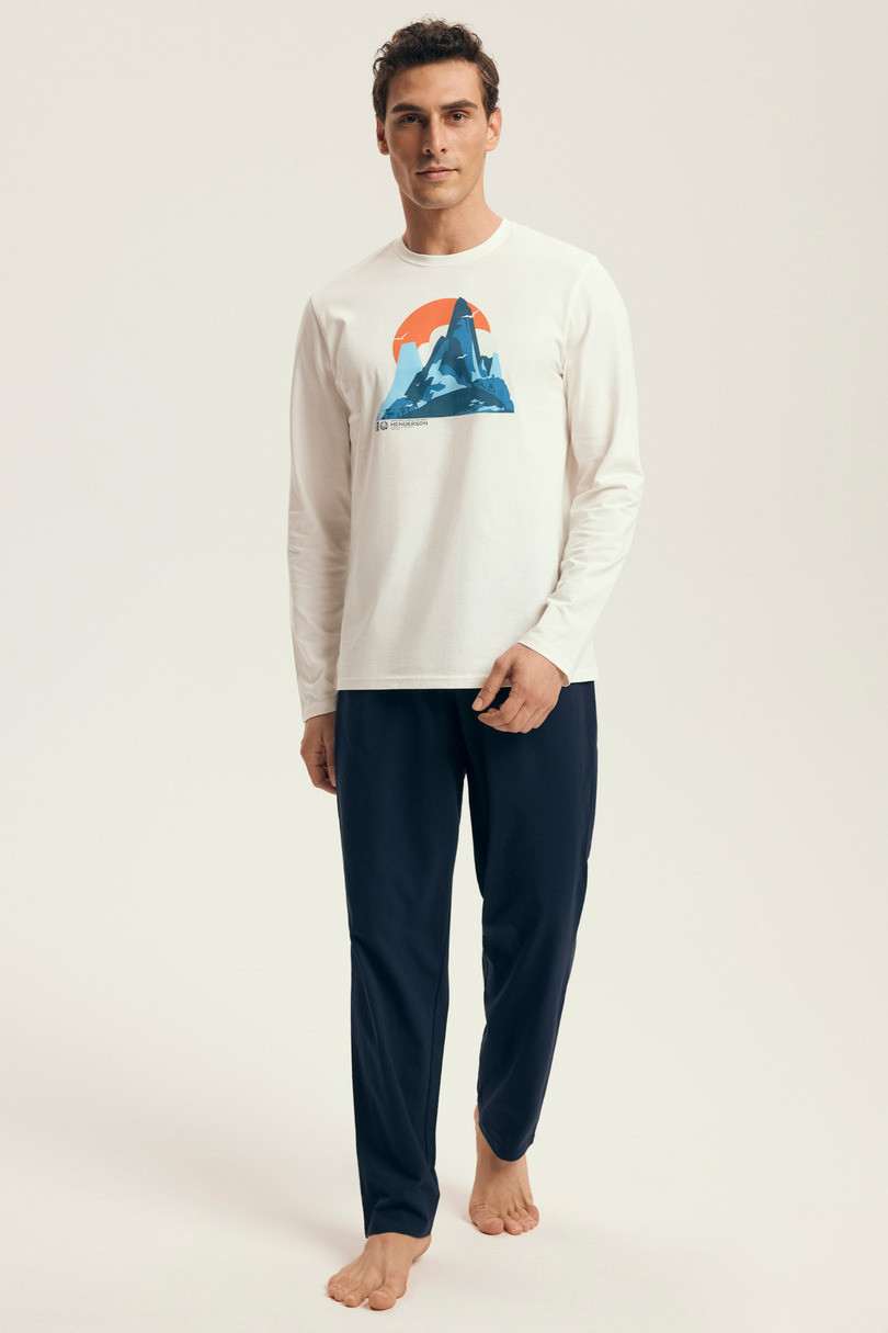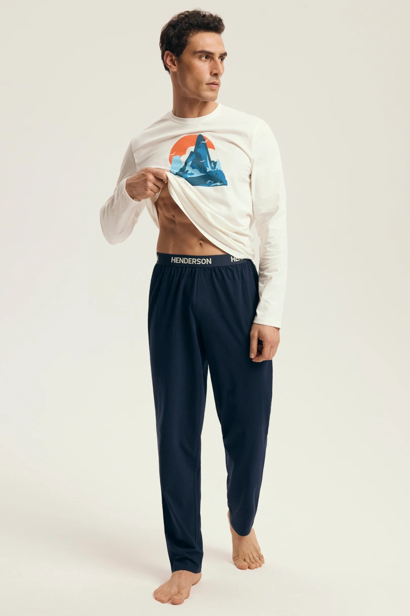 Wybierz relaks w stylu outdoor z piżamą męską LOJI 43475 od marki Henderson. Wykonana w 100% z naturalnej, miękkiej bawełny, zapewnia pełen komfort snu i oddychalność przez całą noc. Bluzka z długim rękawem ozdobiona graficznym nadrukiem gór na tle zachodzącego słońca doskonale wpisuje się w estetykę natury i przygody. Gładkie, granatowe spodnie z elastycznym pasem gwarantują swobodę ruchów i idealne dopasowanie. To doskonały wybór dla mężczyzn, którzy cenią wygodę, styl i inspirację czerpaną z natury.