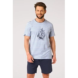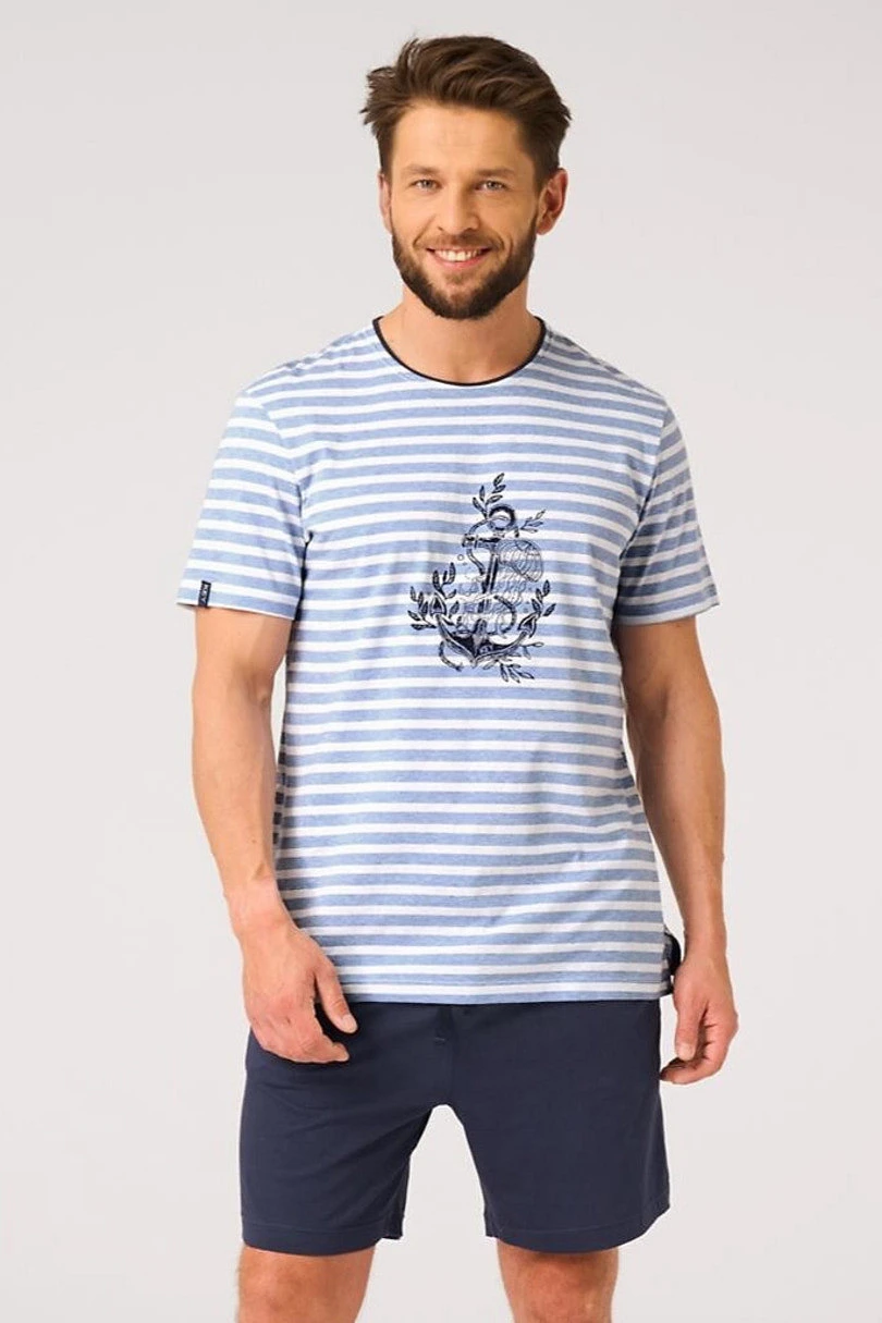 Stylové a pohodlné pánské pyžamo ideální pro jarně-letní sezónu. Vrchní díl v klasickém modrobílém pruhu byl ve střední části ozdoben jemným námořnickým potiskem, který celku dodává sváteční charakter. Tričko s krátkým rukávem a kulatým výstřihem zajišťuje volnost pohybu a pohodlí při nošení.