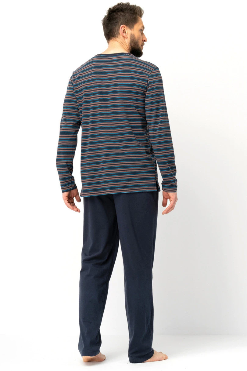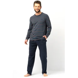 Piżama męska MNS 315 to połączenie komfortu i elegancji w domowym wydaniu. Górna część to miękka, przewiewna koszulka z długim rękawem, ozdobiona modnym, poziomym wzorem w paski w odcieniach granatu, bordo i błękitu. Luźny krój zapewnia swobodę ruchów, a miękki materiał delikatnie otula ciało. Spodnie w jednolitym granatowym kolorze, wykonane z przyjemnej w dotyku dzianiny, posiadają prostą nogawkę, dzięki czemu leżą wygodnie i nie krępują ruchów podczas snu. Całość doskonale sprawdzi się zarówno jako strój nocny, jak i wygodny ubiór domowy.