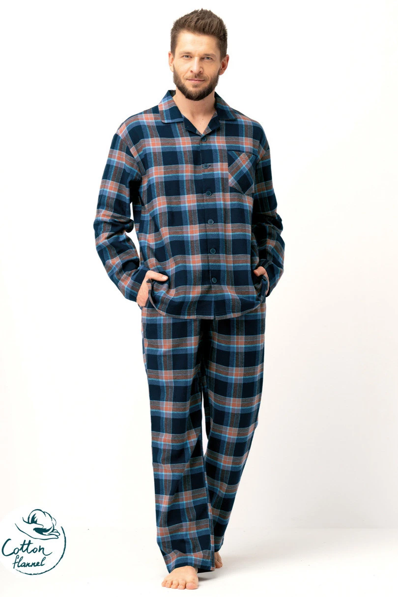 Piżama męska wykonana z miękkiej bawełny flanelowej to gwarancja komfortu i ciepła w chłodne dni. Klasyczna góra w formie koszuli zapinanej na guziki posiada kołnierzyk oraz praktyczną kieszonkę na piersi. Spodnie o prostym kroju zapewniają swobodę ruchów, a elastyczny pas gwarantuje wygodne dopasowanie. Wzór w granatowo-brązową kratę nadaje piżamie ponadczasowego, męskiego charakteru. To doskonały wybór zarówno do nocnego odpoczynku, jak i leniwych poranków w domowym zaciszu.