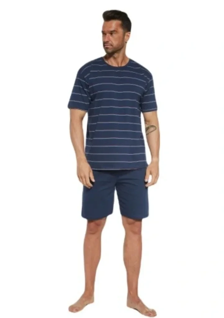 Pohodlné bavlněné pánské pyžamo s krátkým rukávem a kalhoty od značky Cornette. Vrchní díl má na tričku potisk a má kulatý výstřih. Pyžamo má krátké kalhoty, bez úpletů. V pase je všitá pohodlná guma.