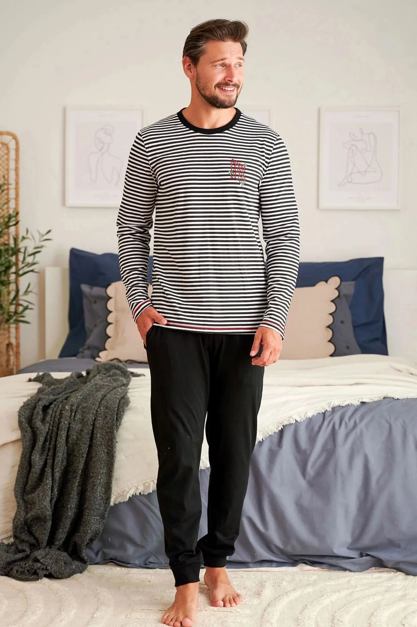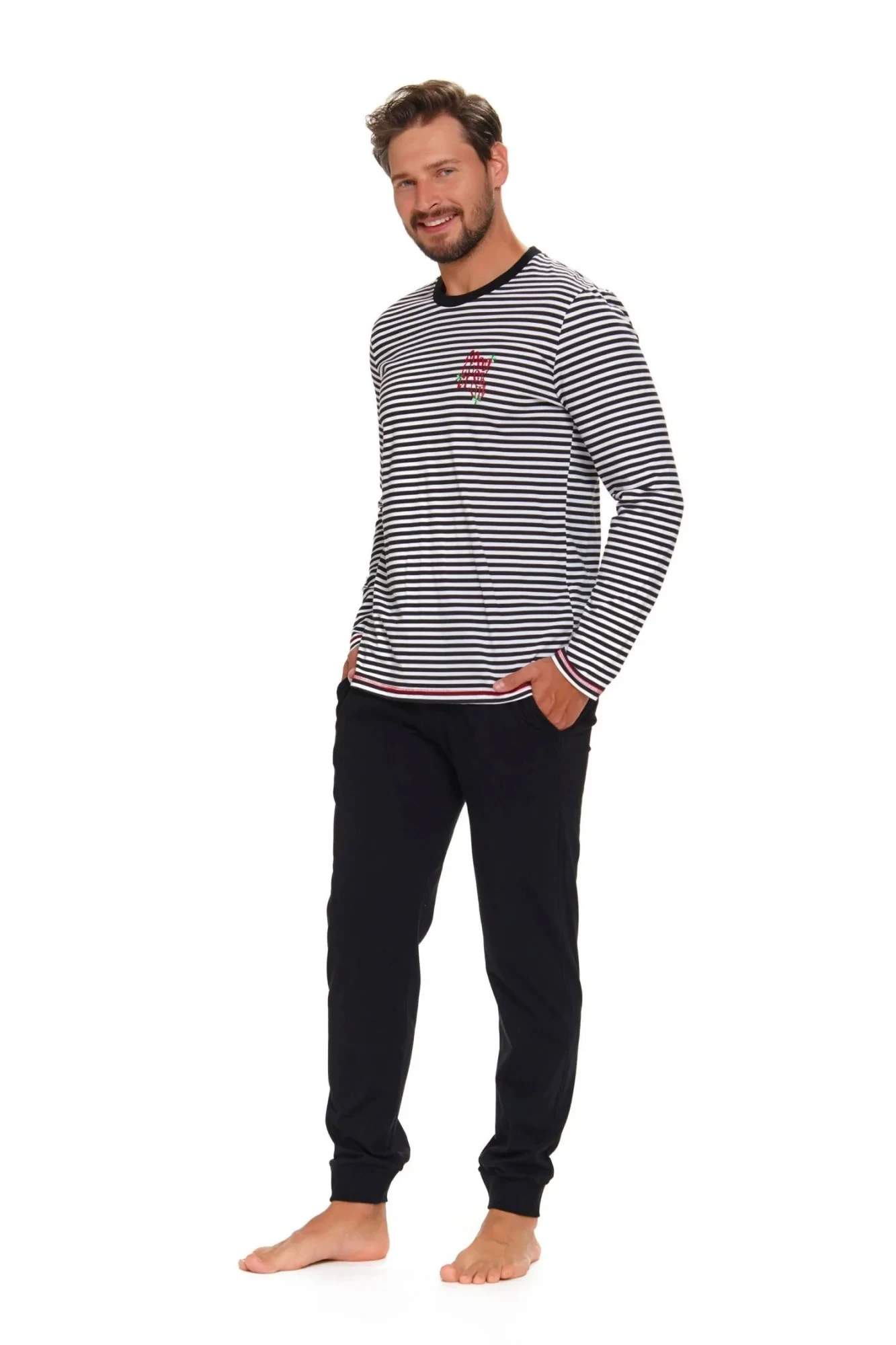 Pánské pyžamo 5234 plus Doctornap - vyrobené z velmi kvalitní a příjemné bavlny - černo-bílé pruhované tričko s dlouhými rukávy - na přední straně ozdobené potiskem - dlouhé tmavé kalhoty s kapsami - certifikát OEKO-TEX Standard 100