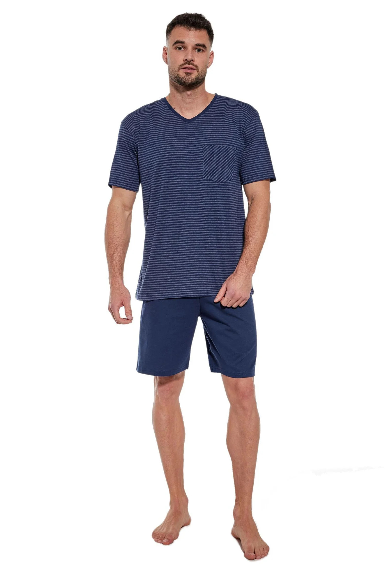 Pánské pyžamo 332/163 Bruce CORNETTE - z vysoce jakostní bavlny - tmavě modré tričko s krátkými rukávy - na přední straně zdobené kapsičkou - s pruhy - pohodlné jednobarevné kraťasy