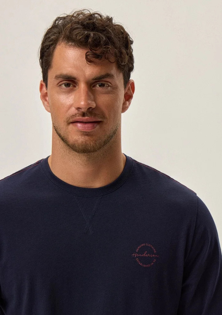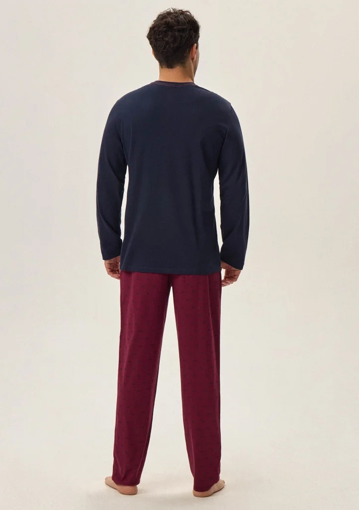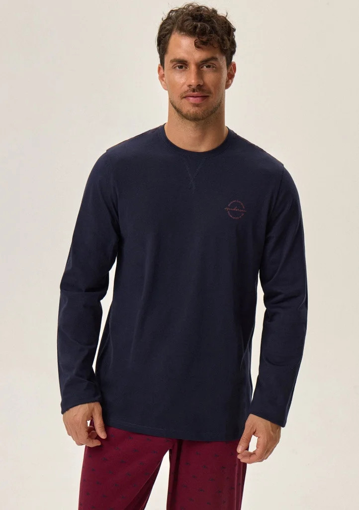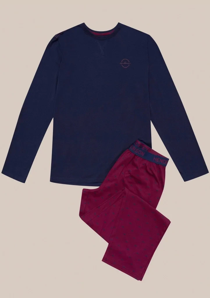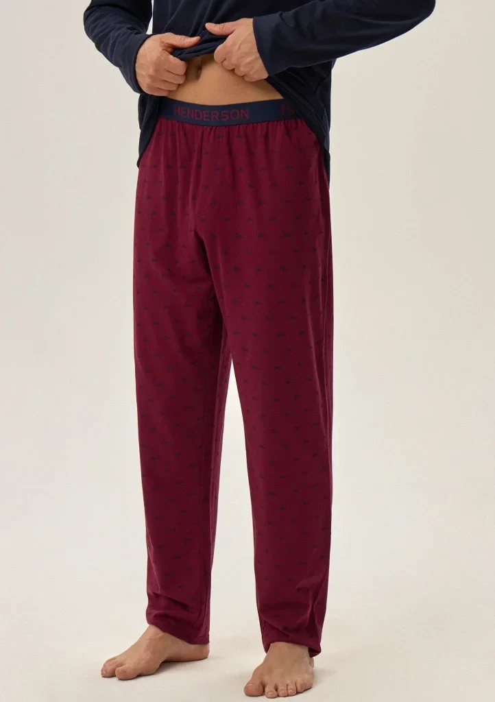 Pánské pyžamo značky Henderson. Pyžamo se skládá z trička s dlouhým rukávem, rukávy a spodní část trička je volná. Okolo krku je kulatý výstřih s pružným lemem. Na levé straně je menší nápis. Kalhoty jsou volnější, v pase jsou do pružné gumy na které je po celém odvodu nápis Henderson. Nohavice jsou ukončené volně a jsou celé potištěné.