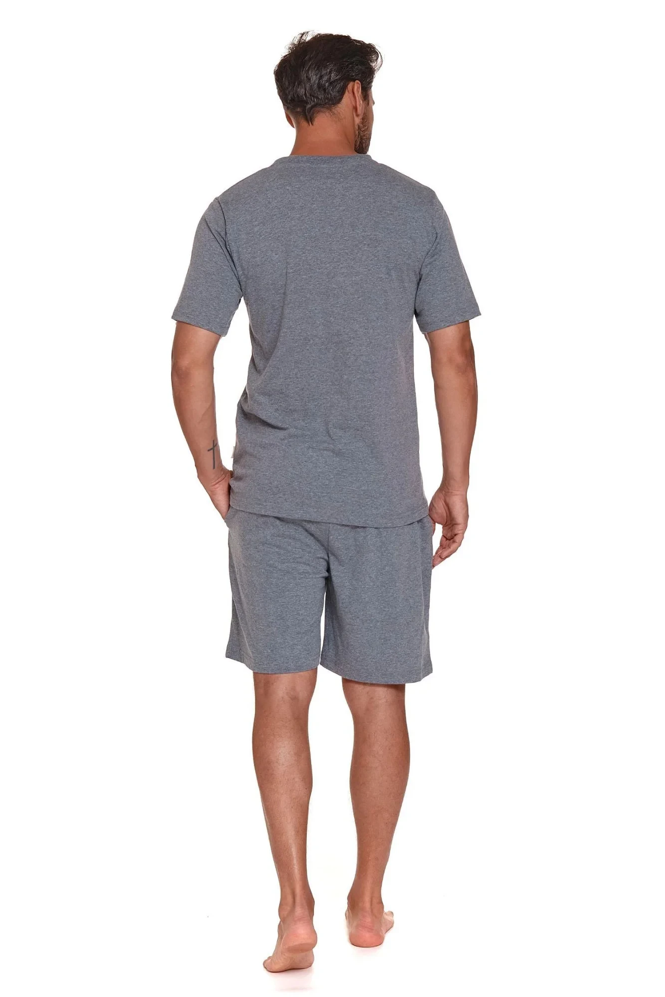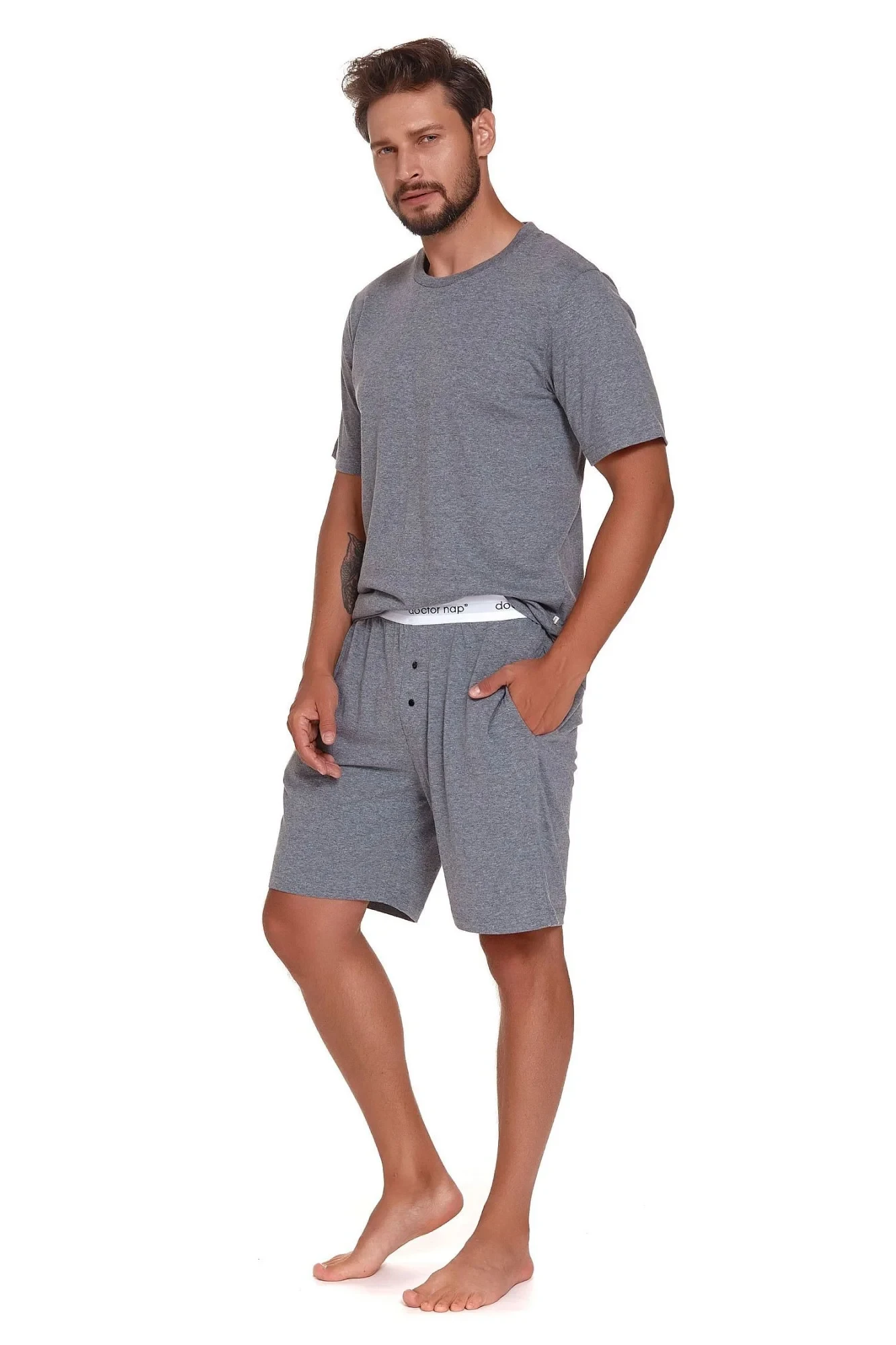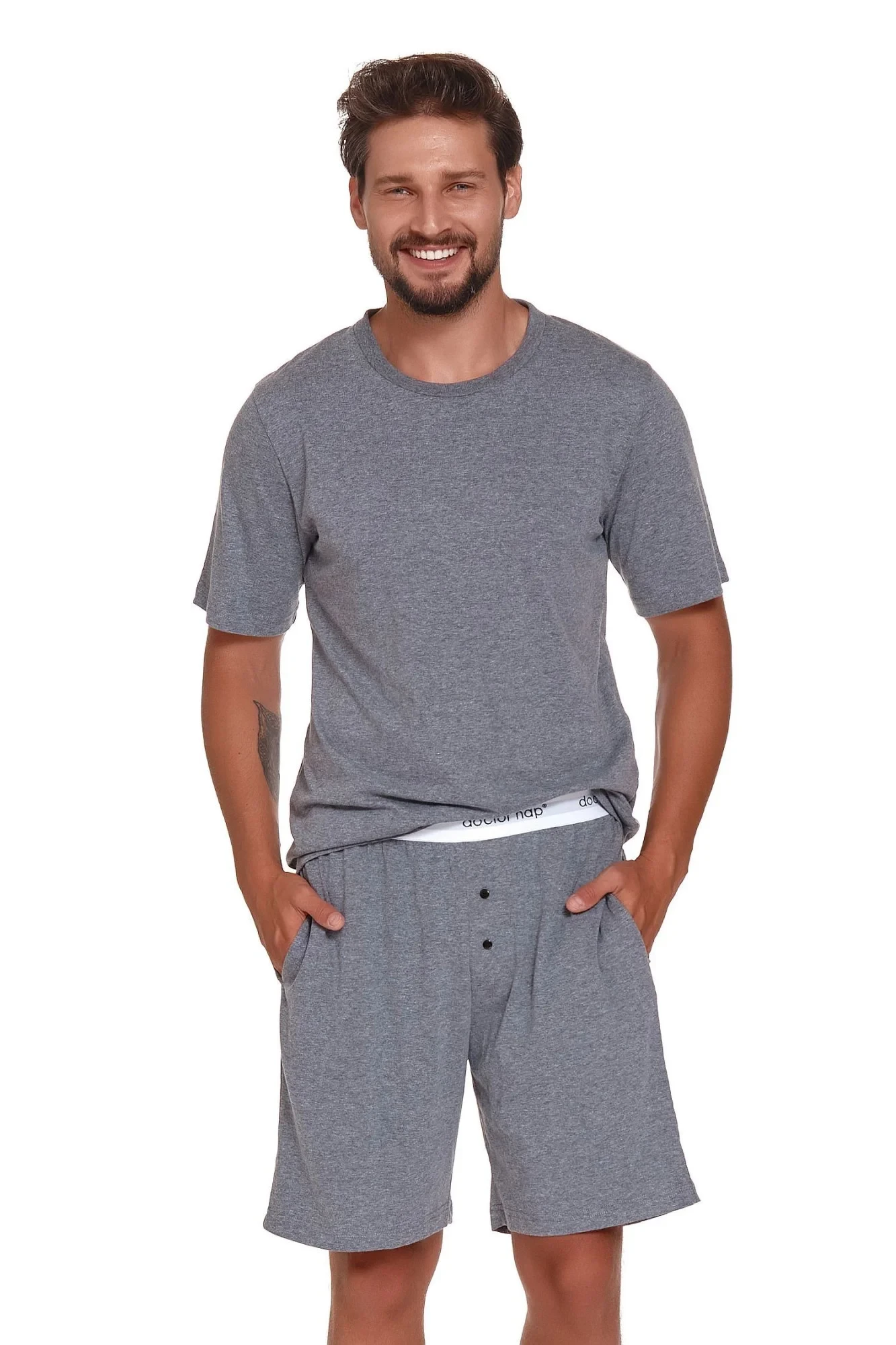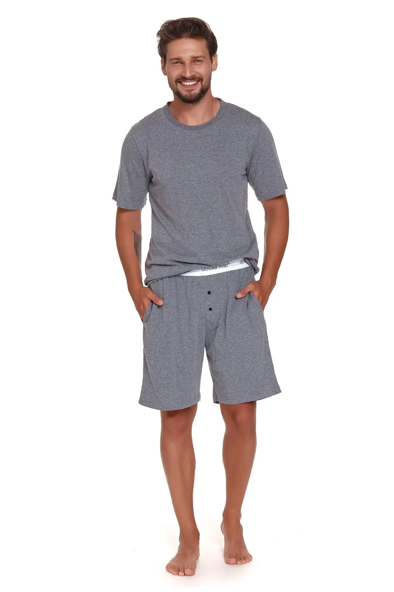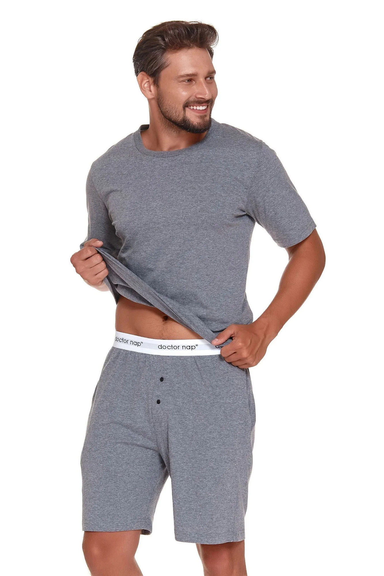 Pánské pyžamo 4332 grey Doctornap - z vysoce jakostní bavlny - šedé tričko s krátkými rukávy - na přední straně kapsička - delší šortky šedé barvy - zapínání v rozkroku - elastická guma v pase s nápisem