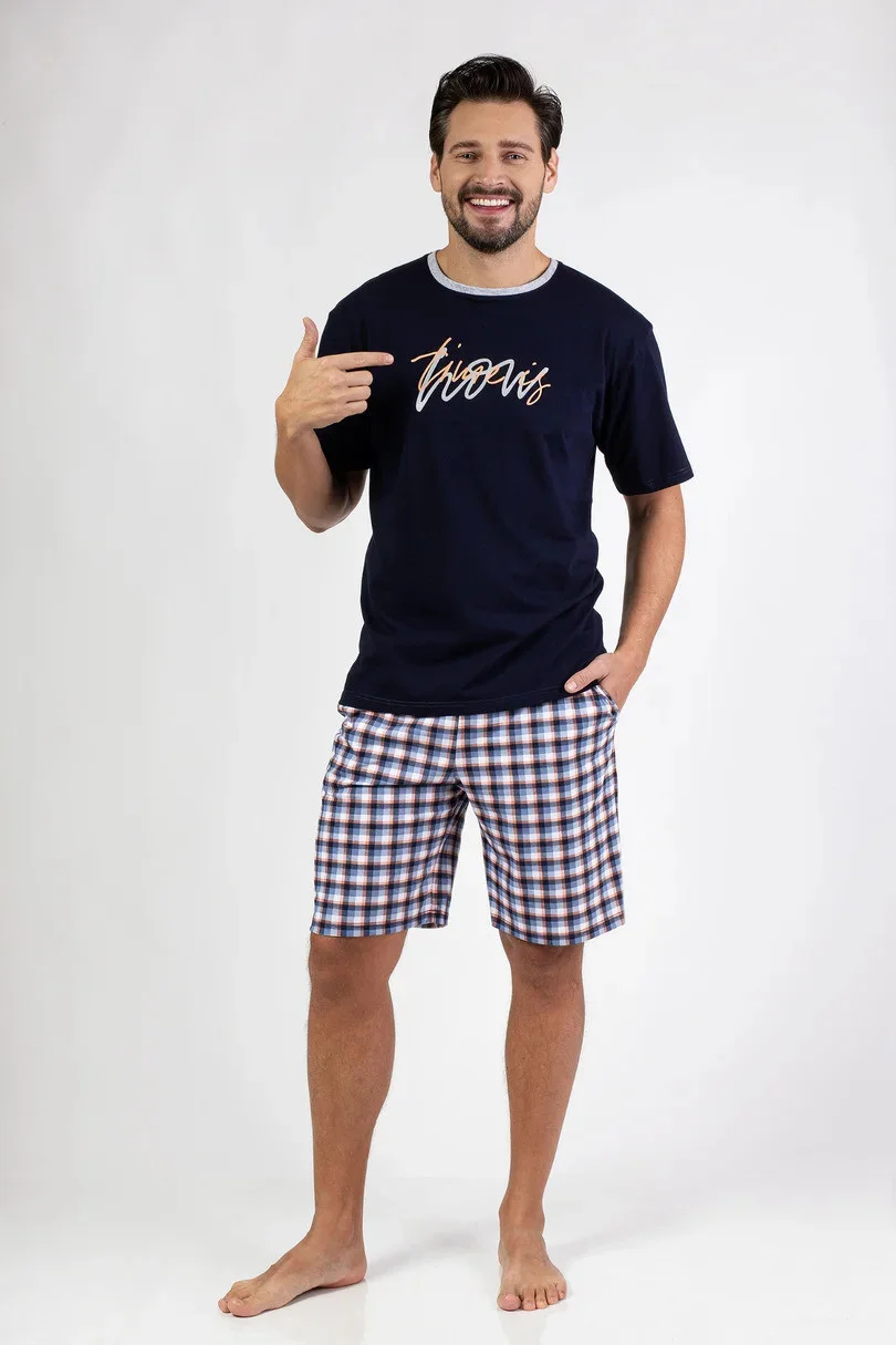 Pánské pyžamo s krátkými rukávy, kulatým výstřihem, vpředu zdobené jemným potiskem, krátké kostkované šortky s kapsami.
