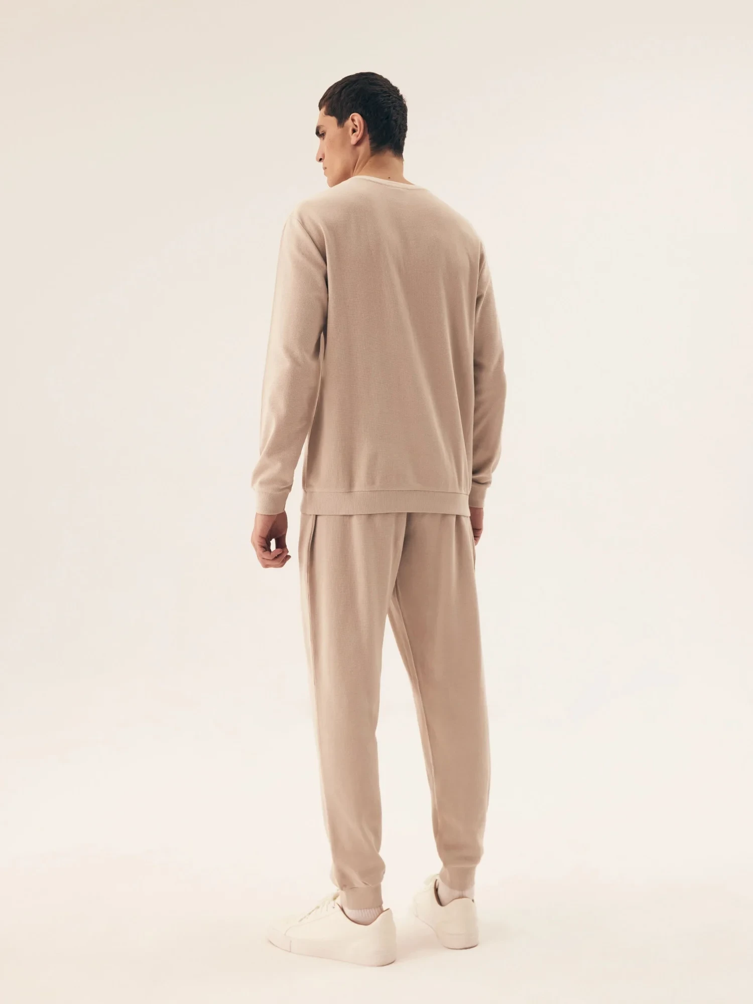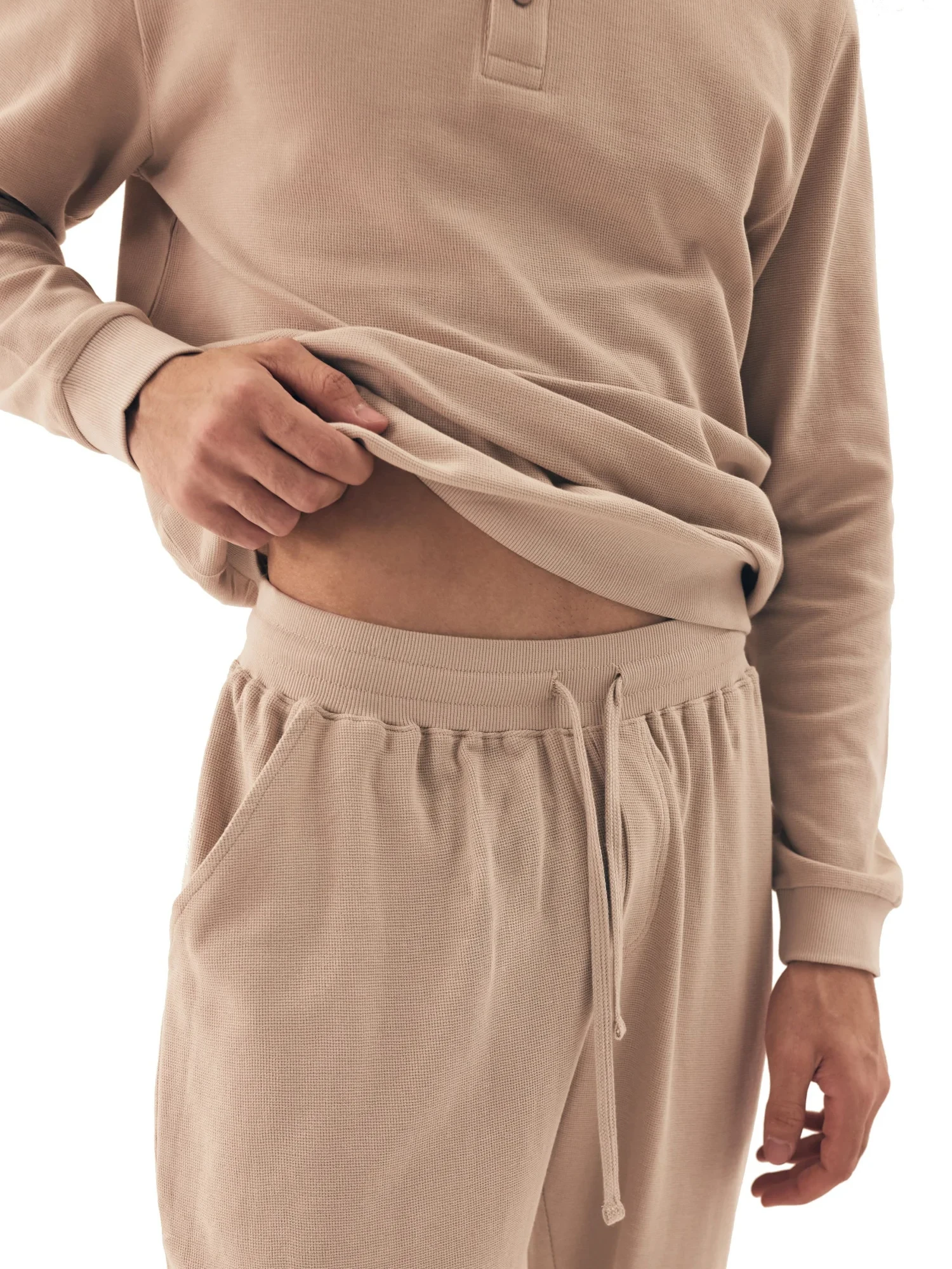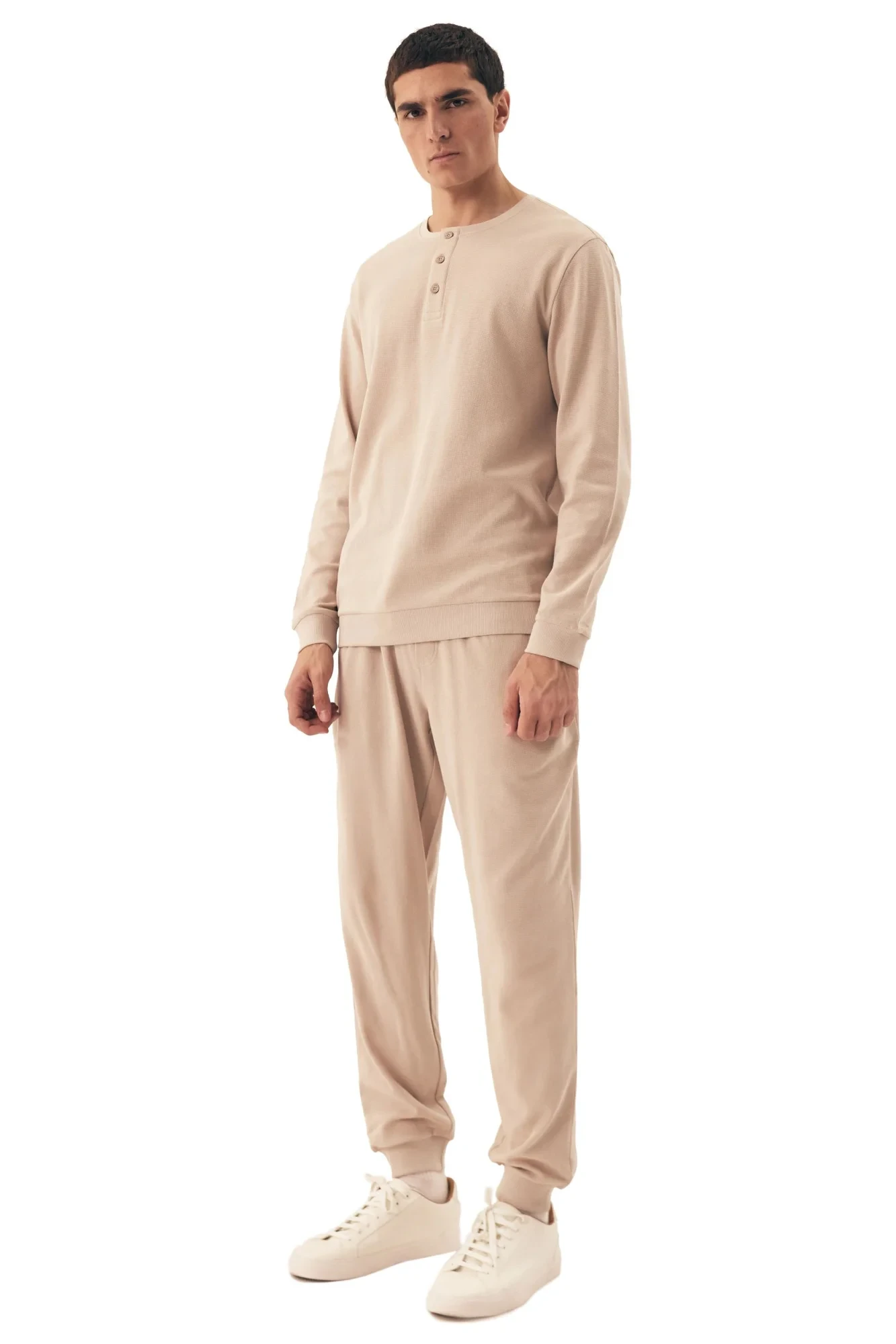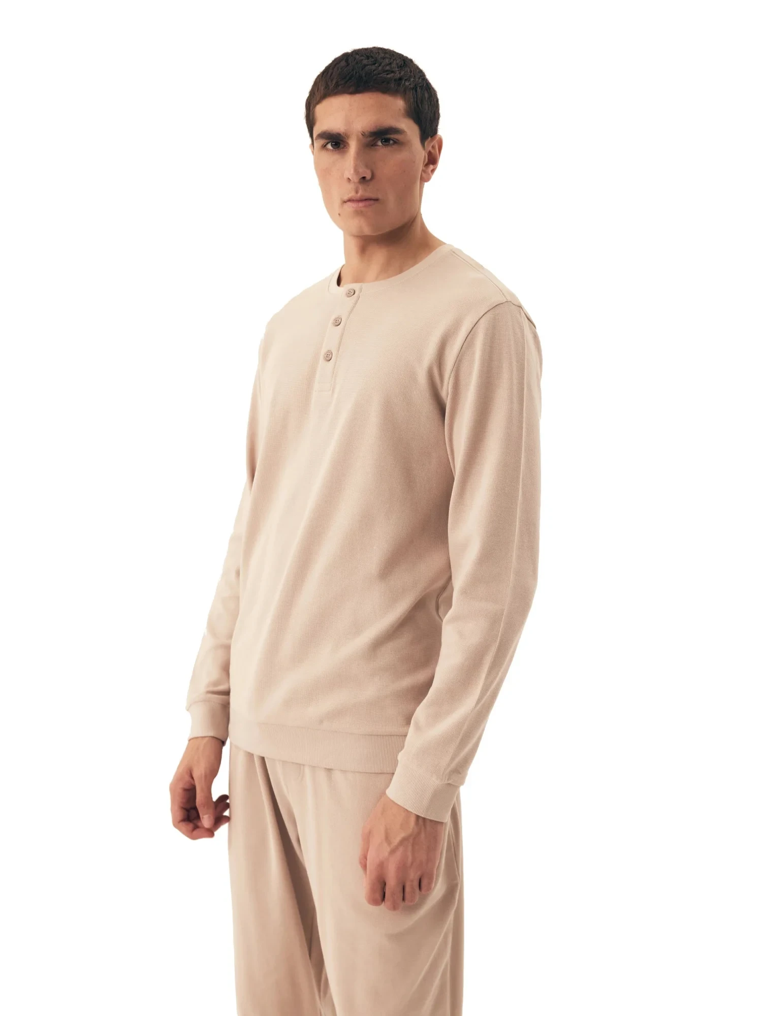 Pánské pyžamo 42638 Desert beige HENDERSON - z vysoce jakostní bavlny se strukturou - béžové tričko s dlouhými rukávy - výstřih se zapínáním na knoflíčky - dlouhé kalhoty béžové barvy - široký elastický pás se šňůrkou v pase - kapsy na bocích - rukávy, spodní lem a nohavice zakončené žebrovanými manžetami