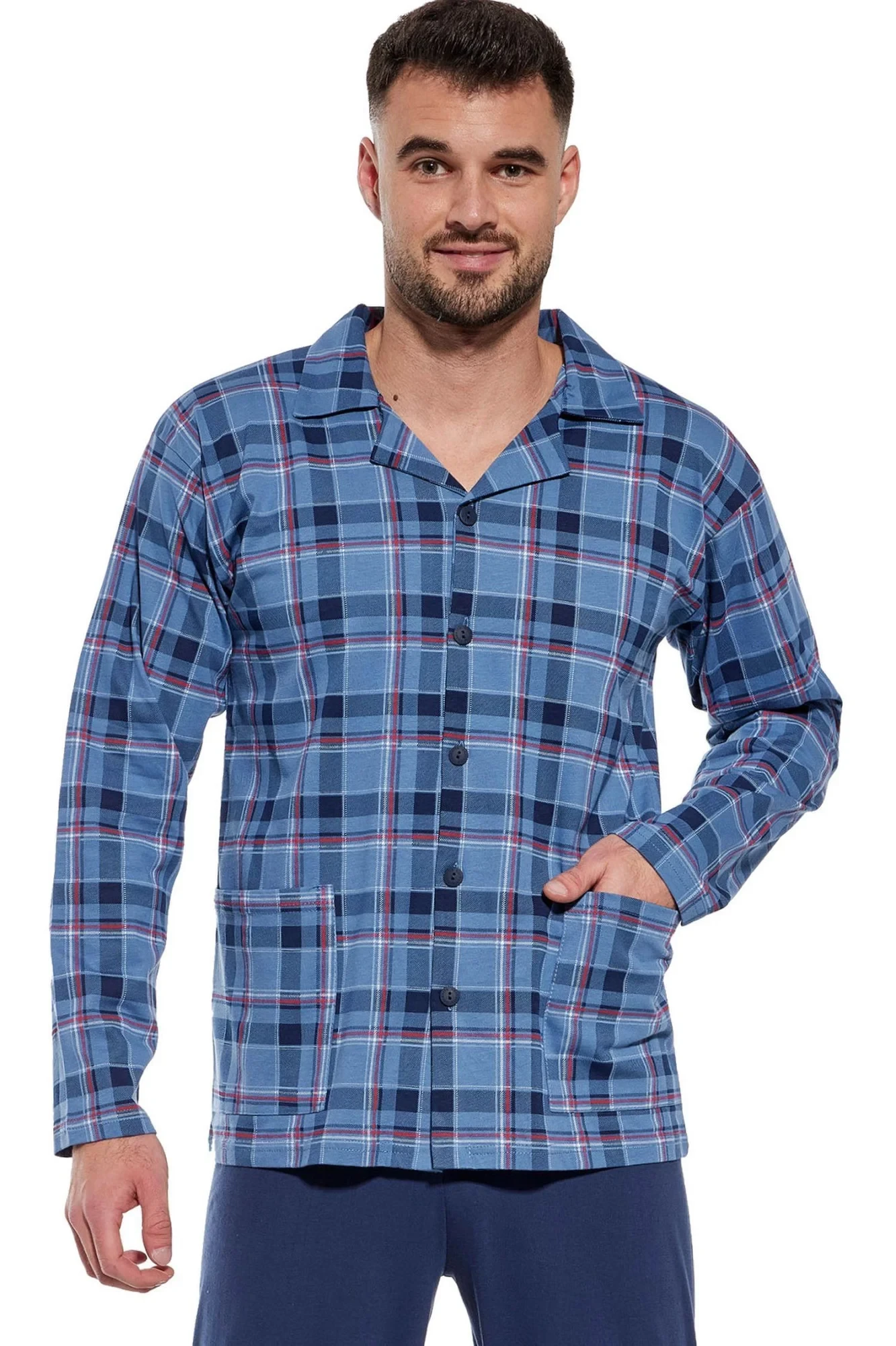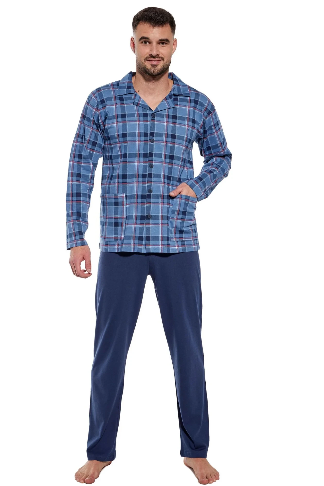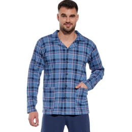 Pánské pyžamo 114/68 CORNETTE - z vysoce jakostní bavlny - světle modrá vzorovaná košile s dlouhými rukávy a kapsami - zapínání na knoflíky - pohodlné jednobarevné dlouhé kalhoty