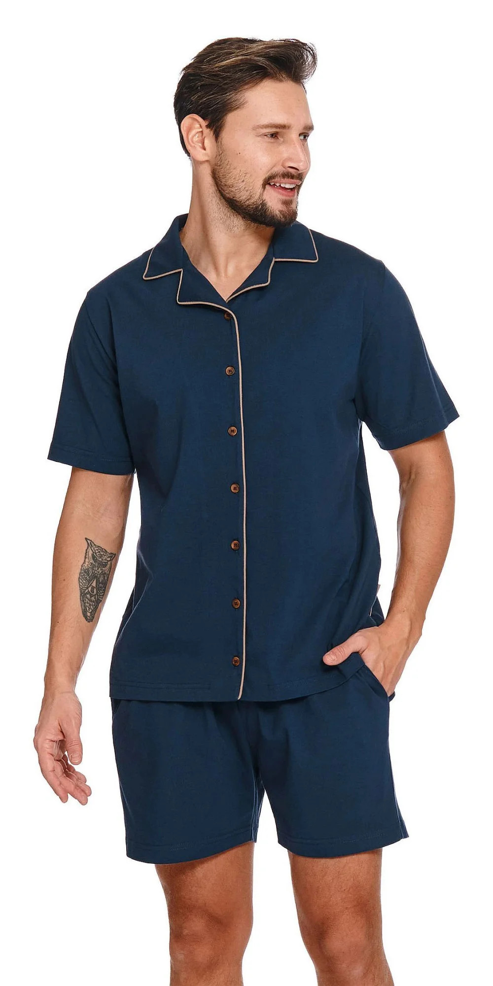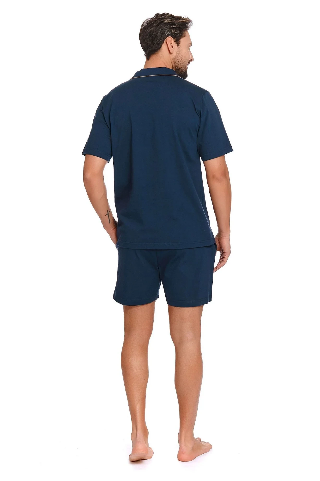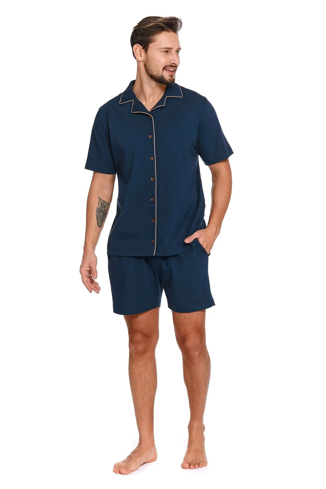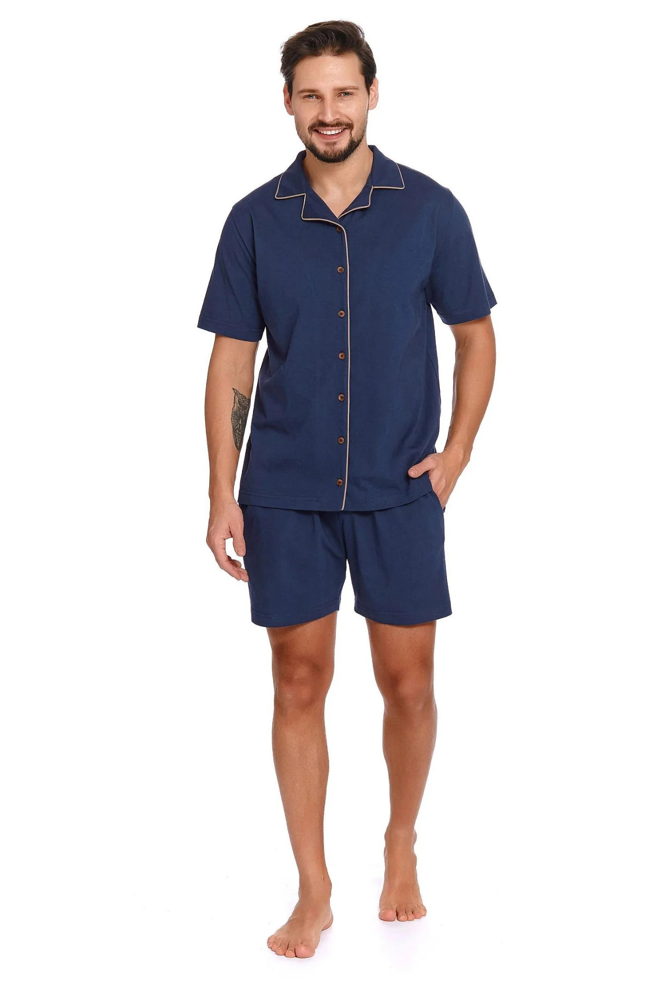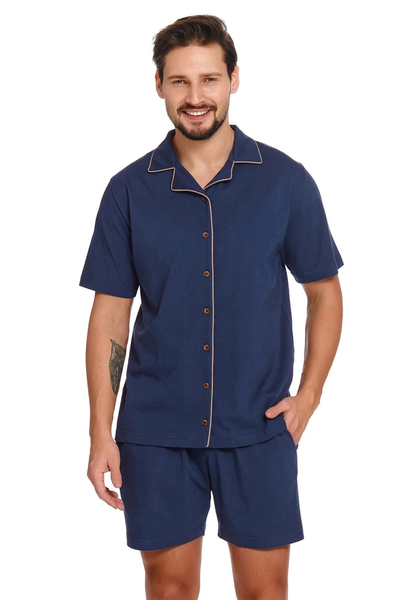 Pánské pyžamo 4261 Doctornap - z velmi kvalitní bavlny - tmavě modrá košile s krátkými rukávy - zapínání na knoflíky po celé délce - modré kraťasy s kapsami - zlaté lemování - hypoalergenní - vhodné pro alergiky a pro všechny, kteří trpí na podráždění kůže - certifikát OEKO-TEX Standard 100