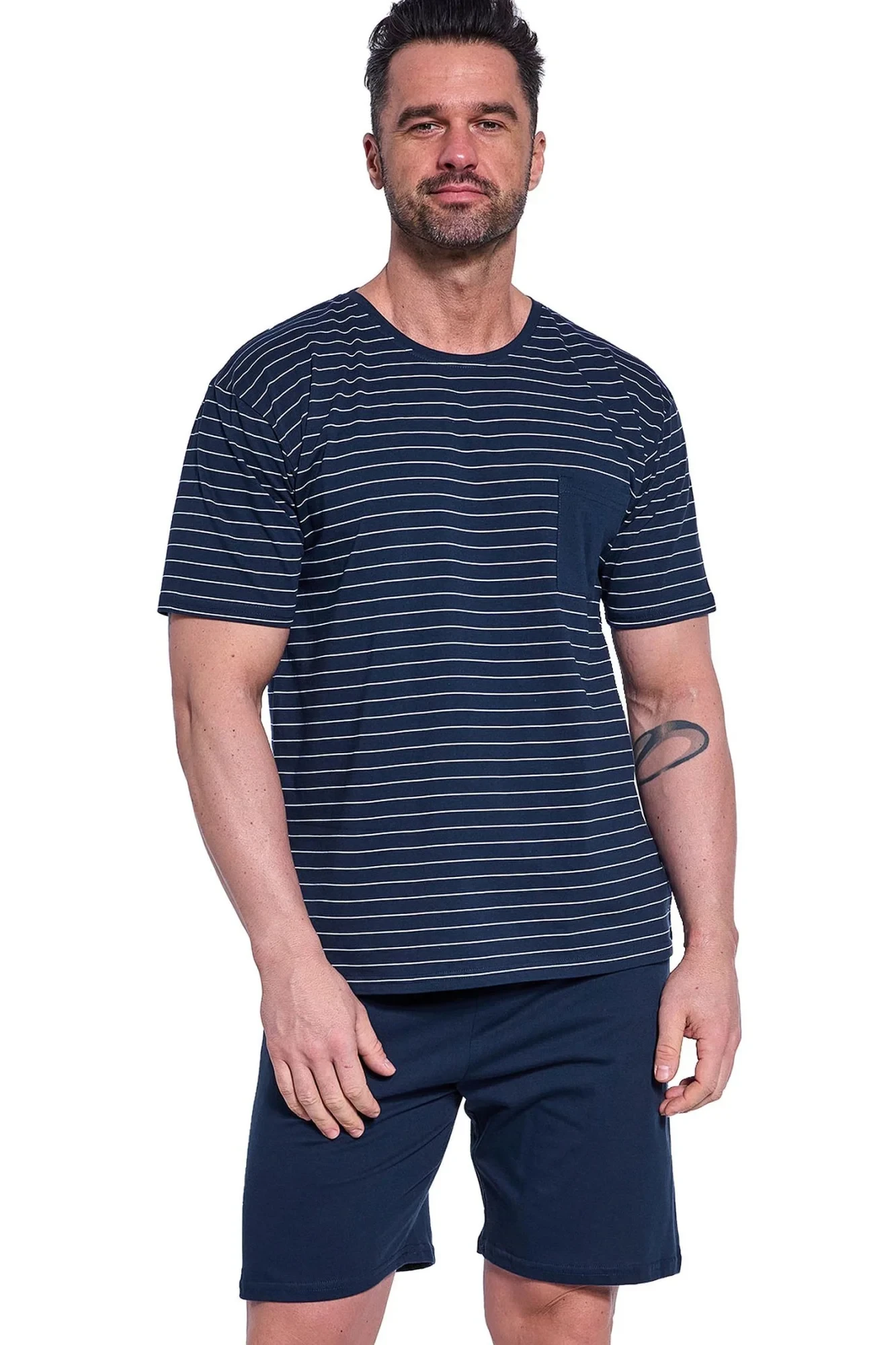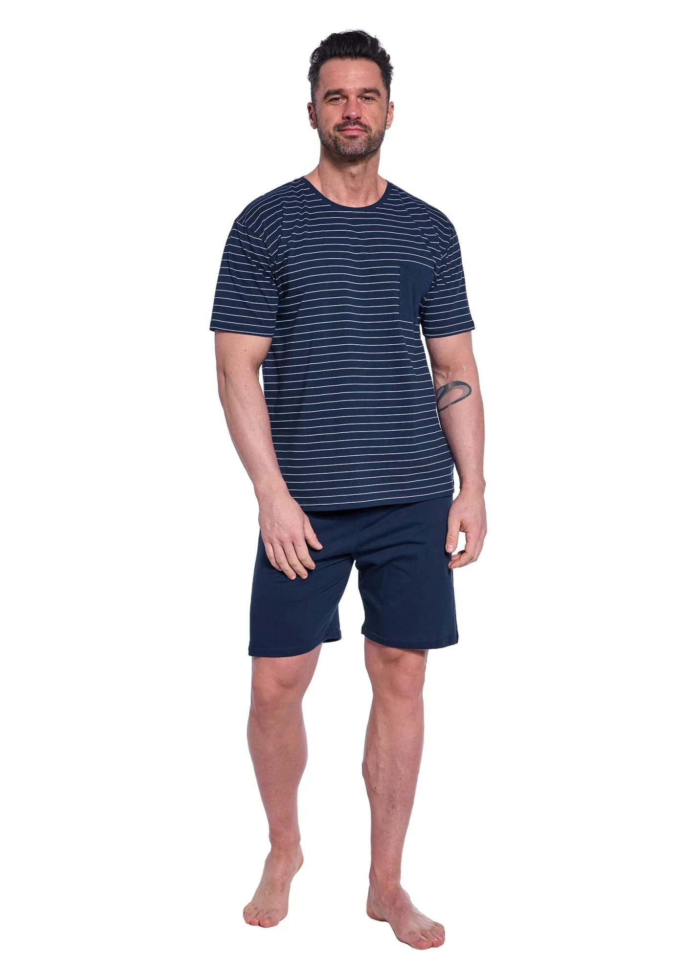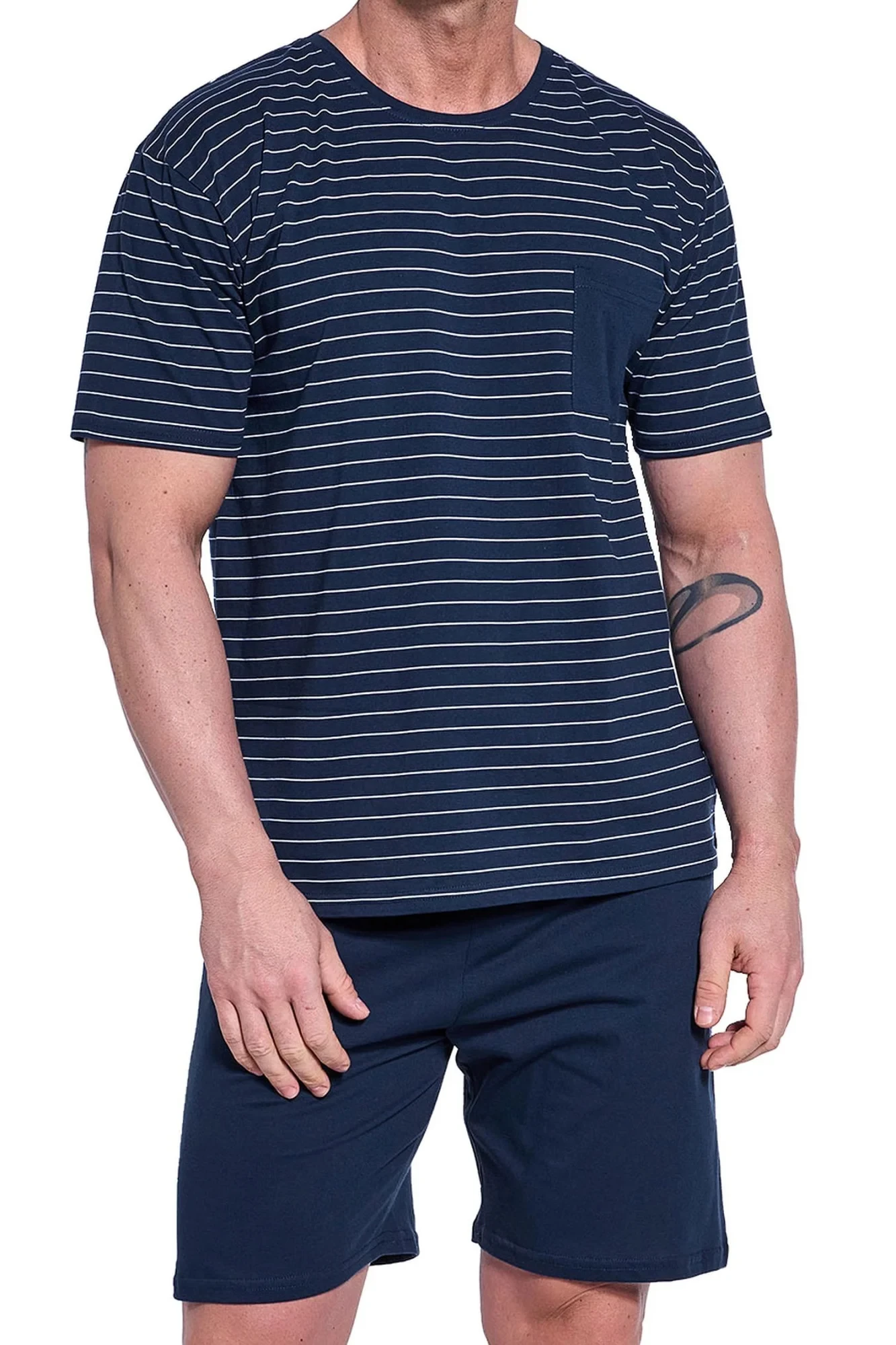 Pánské pyžamo 325/175 Lagoon CORNETTE - z vysoce jakostní bavlny - tmavě modré tričko s krátkými rukávy - s pruhy - ozdobené kapsičkou na přední straně - tmavě modré kraťasy