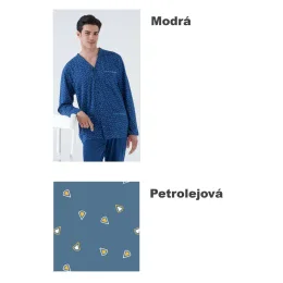 Pánské pyžamo značky Karelpiu. Pyžamo se skládá z kabátku, který je celopropínací na knoflíky, výstřih je do "V". Na levé straně je našitá kapsička a kapsičky jsou našité i ve spodní části. Kalhoty jsou v pase do pružné obšité gumy. Pyžamo nemá žádné lemy a je pohodlné na nošení, je ušité z příjemné bavlny.