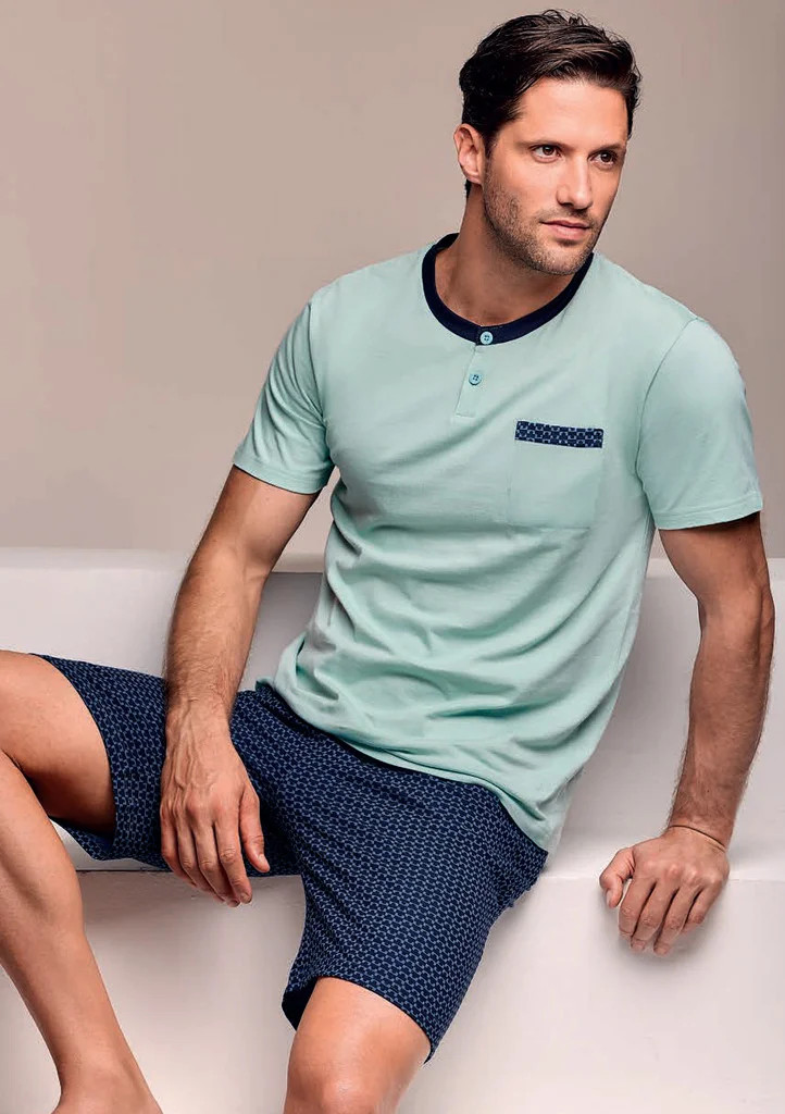 Stylové pánské pyžamo Infiore zaujme elegantní kombinací světle mentolové a tmavě modré. Tričko s krátkým rukávem má kontrastní lem výstřihu, zapínání na knoflíky a ozdobnou kapsičku s jemným vzorem, který ladí s kraťasy. Ty jsou vyrobené z lehkého materiálu a zdobeny drobným geometrickým potiskem. Pyžamo je ideální pro pohodlný spánek i domácí pohodu – díky kvalitní bavlně je příjemné na nošení a dobře drží tvar.