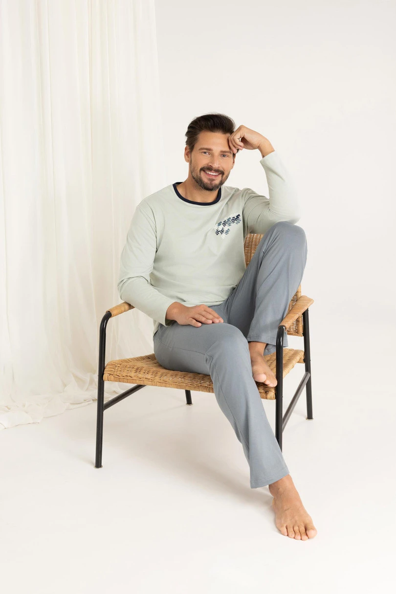 Zajistěte si pohodlný spánek a vypadejte stylově i doma s tímto pánským bavlněným pyžamem model 484 BIG J/25. Souprava obsahuje tričko s dlouhými rukávy, kulatým výstřihem a decentním potiskem na hrudi, které působí moderně, a dlouhé jednobarevné kalhoty, které zajišťují pohodlí a volnost pohybu. Jsou vyrobeny ze 100% měkké a vzdušné bavlny a jsou ideální pro každé roční období – na spaní i jako pohodlná domácí stró