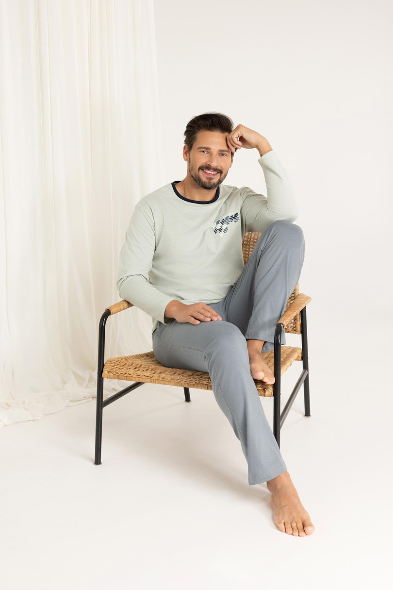 Zajistěte si pohodlný spánek a vypadejte stylově i doma s tímto pánským bavlněným pyžamem model 484 J/25. Souprava obsahuje tričko s dlouhými rukávy, kulatým výstřihem a decentním potiskem na hrudi pro moderní vzhled a dlouhé jednobarevné kalhoty, které zajišťují pohodlí a volnost pohybu. Jsou vyrobeny ze 100% měkké a prodyšné bavlny a jsou ideální pro každé roční období – jak na spaní, tak jako pohodlná domácí stró