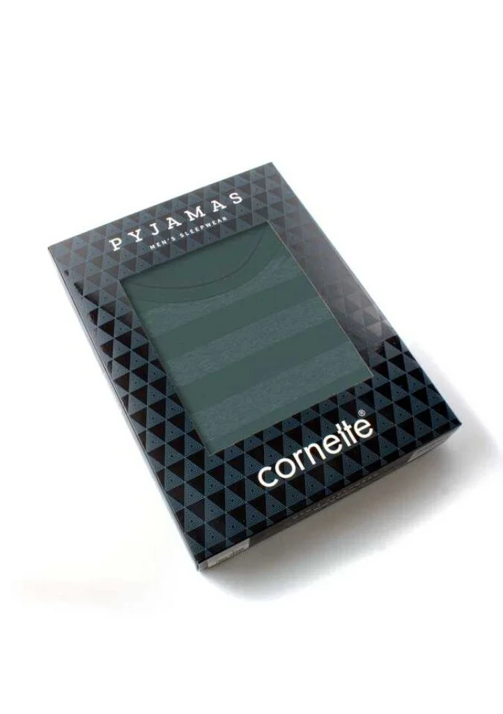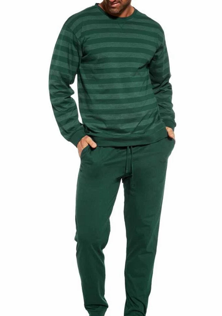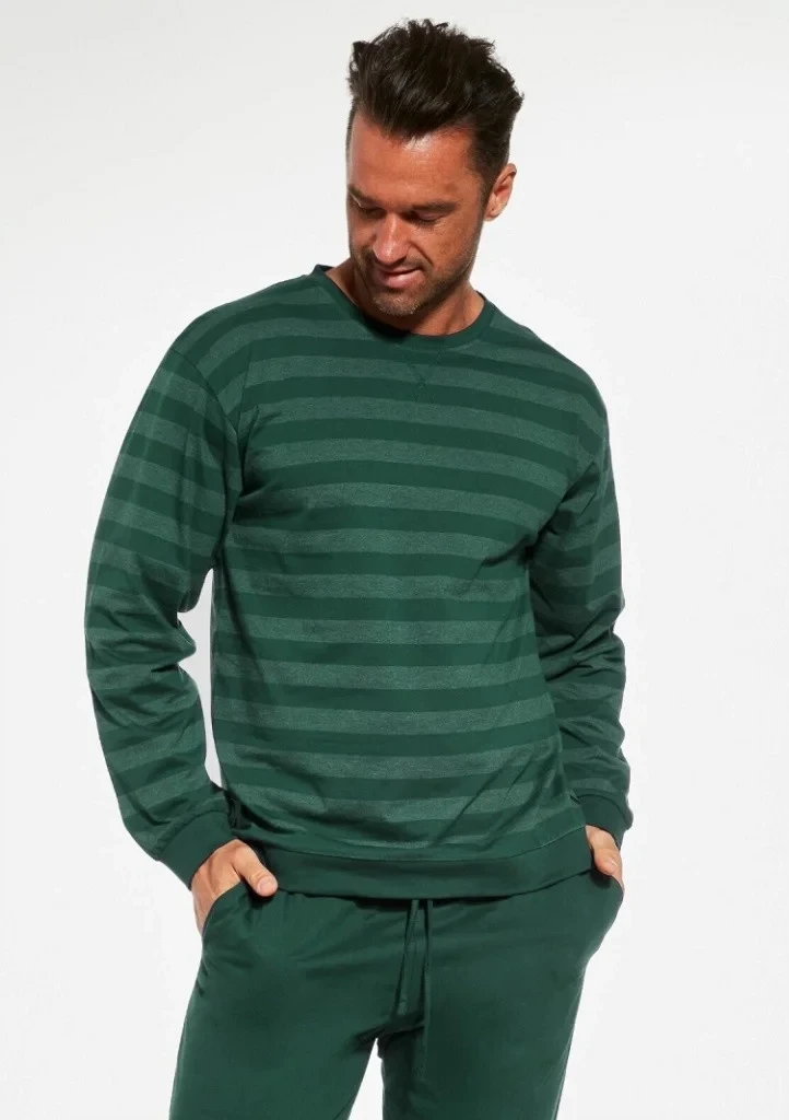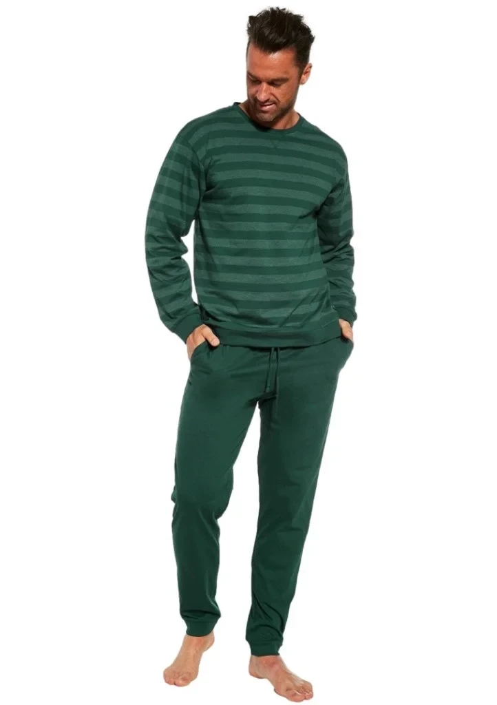 Pohodlné bavlněné pánské pyžamo s dlouhým rukávem a kalhoty od značky Cornette. Vrchní díl má na obou stranách potisk proužků a má kulatý výstřih. Pyžamo má dlouhé kalhoty, které jsou ukončené do úpletů. V pase je všitá pohodlná guma v které je provlečená šňůrka na utáhnutí. Na bocích kalhot jsou zapuštěné kapsy.
