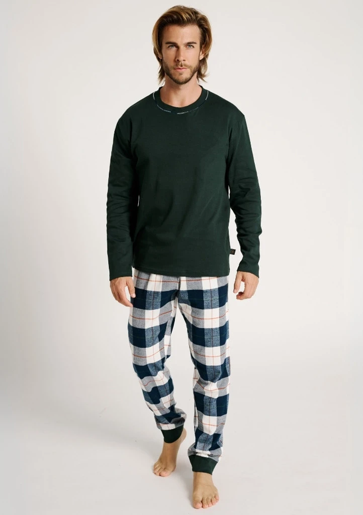 Pánské pyžamo Muydemi ideální na chladné zimní večery. Horní díl tvoří tmavě zelené tričko s dlouhým rukávem, které je sladěno s kostkovanými kalhotami v odstínech modré, šedé a bílé. Pyžamo je vyrobeno ze 100% polyesteru s jemným plyšovým povrchem, který je mimořádně měkký, hřejivý a hřejivý na dotek. Díky manžetám na rukávech a nohavicích skvěle sedí a poskytuje maximální pohodlí při spánku i odpočinku doma. Dodáváno v dárkové krabičce, takže je vhodné i jako dárek.