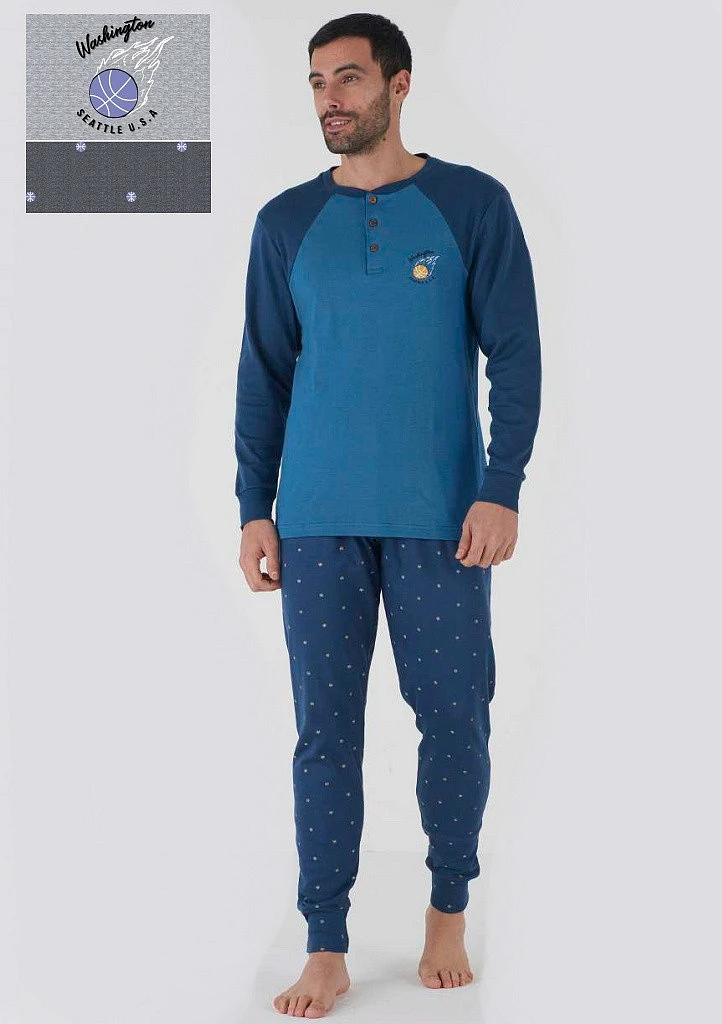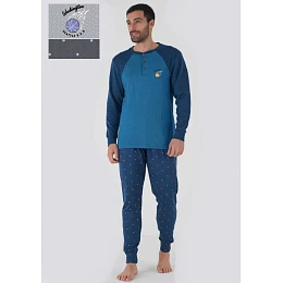 Pánské pyžamo italské značky Karelpiu. Pyžamo se skládá ze dvou dílů. Tričko má dlouhé rukávy, které jsou ukončené do manžety. Spodní část je volná, okolo krku je kulatý výstřih, který má légu na tři knoflíky. Na levé straně je našitá kapsička. Kalhoty jsou v pase do pohodlné gumy, nohavice jsou ukončené do pružné manžety. Pyžamo je ušité z příjemné hřejivé bavlny.