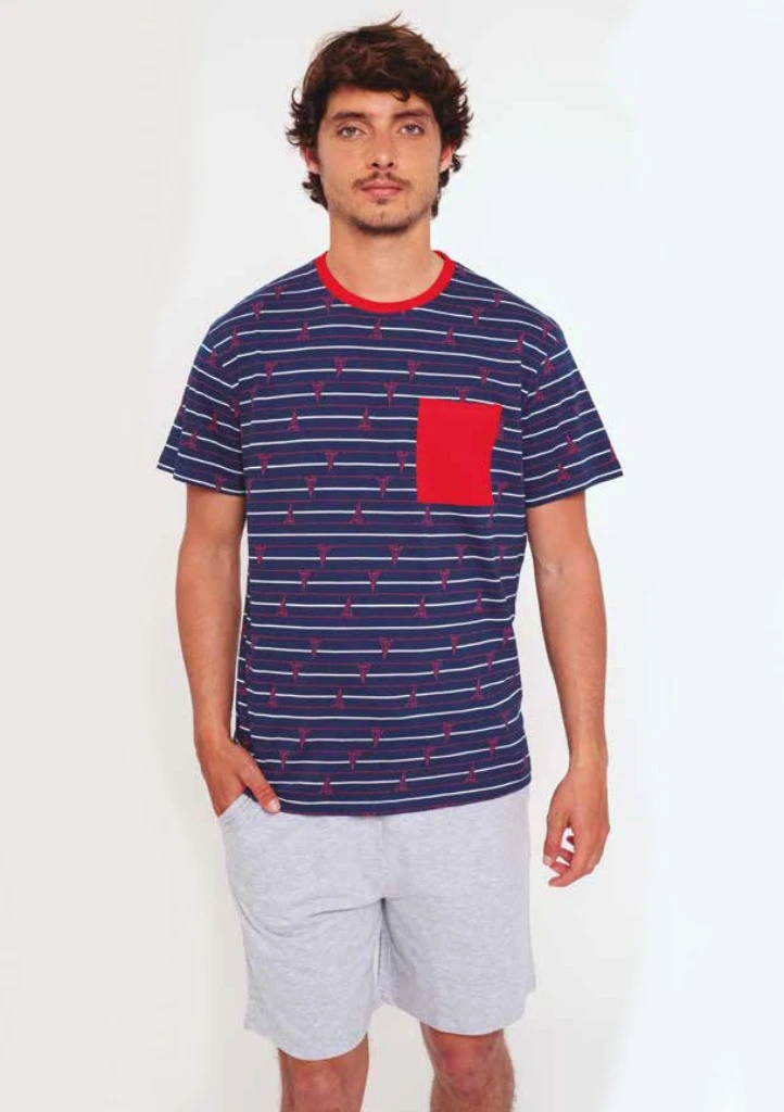 Pánské bavlněné pyžamo od značky Muydemi. Pyžamo je ze 100% bavlny, velmi příjemné a pohodlné i v letních měsících. Tričko má krátký rukáv, kulatý výstřih. Na levé přední straně je našitá kapsička. Volné kraťasy mají v pase pohodlnou pružnou gumu.
