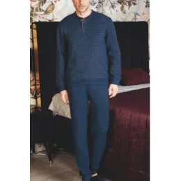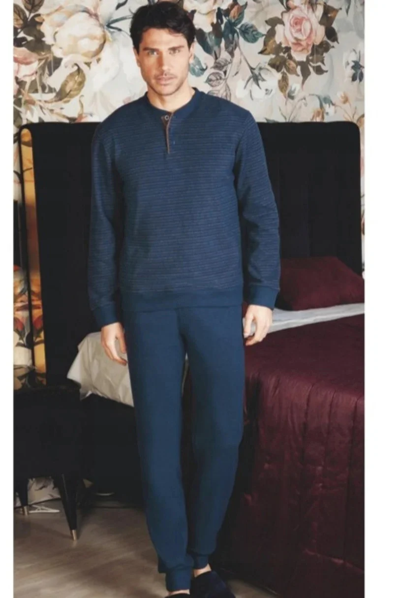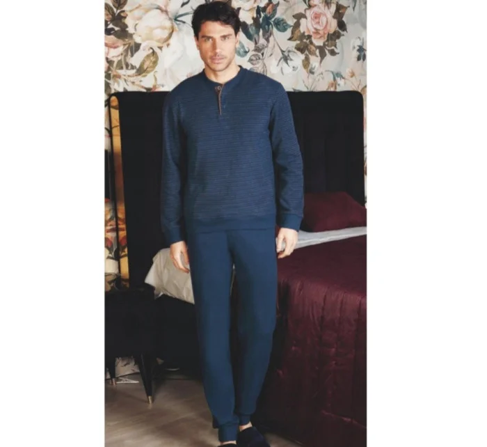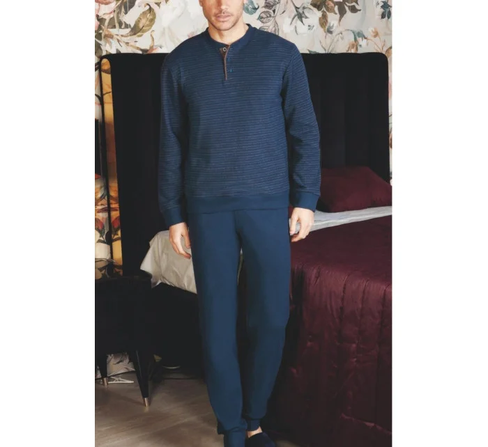Pánské pyžamo z měkkého úpletu . Tričko s dlouhým rukávem a kapsou na přední straně, dlouhé kalhoty, výstřih, manžety, spodní část trička a kalhoty s pohodlným žebrovaným lemem.