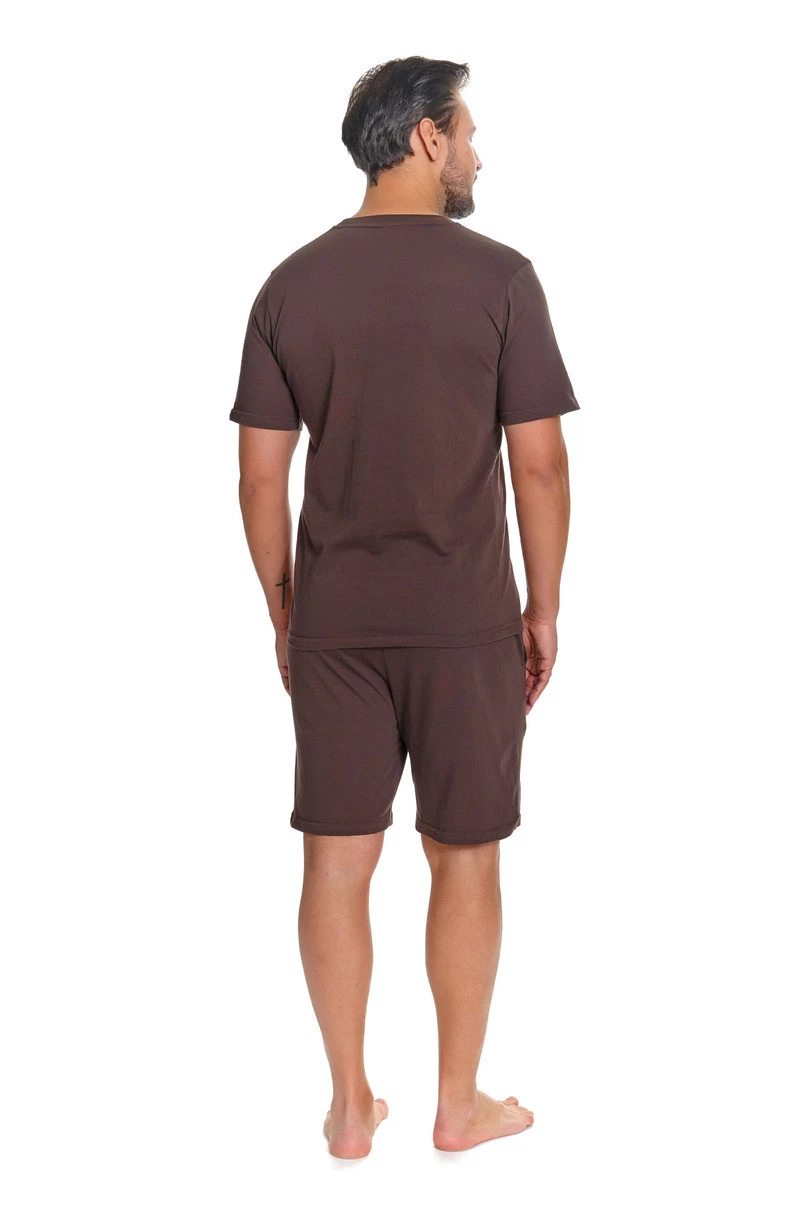 Vrchní díl pyžama tvoří jednotné tričko s krátkým rukávem a jednoduchým univerzálním střihem, který neomezuje v pohybu a je ideální pro všechna roční období. Minimalistický design dodává celku nadčasový charakter.