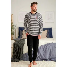 Pánské pyžamo ušité z vysoce kvalitní měkké bavlny. Pruhované tričko s dlouhými rukávy a potiskem na hrudi. Doplňují je dlouhé pevné kalhoty se šňůrkami na nohavicích a kapsami.