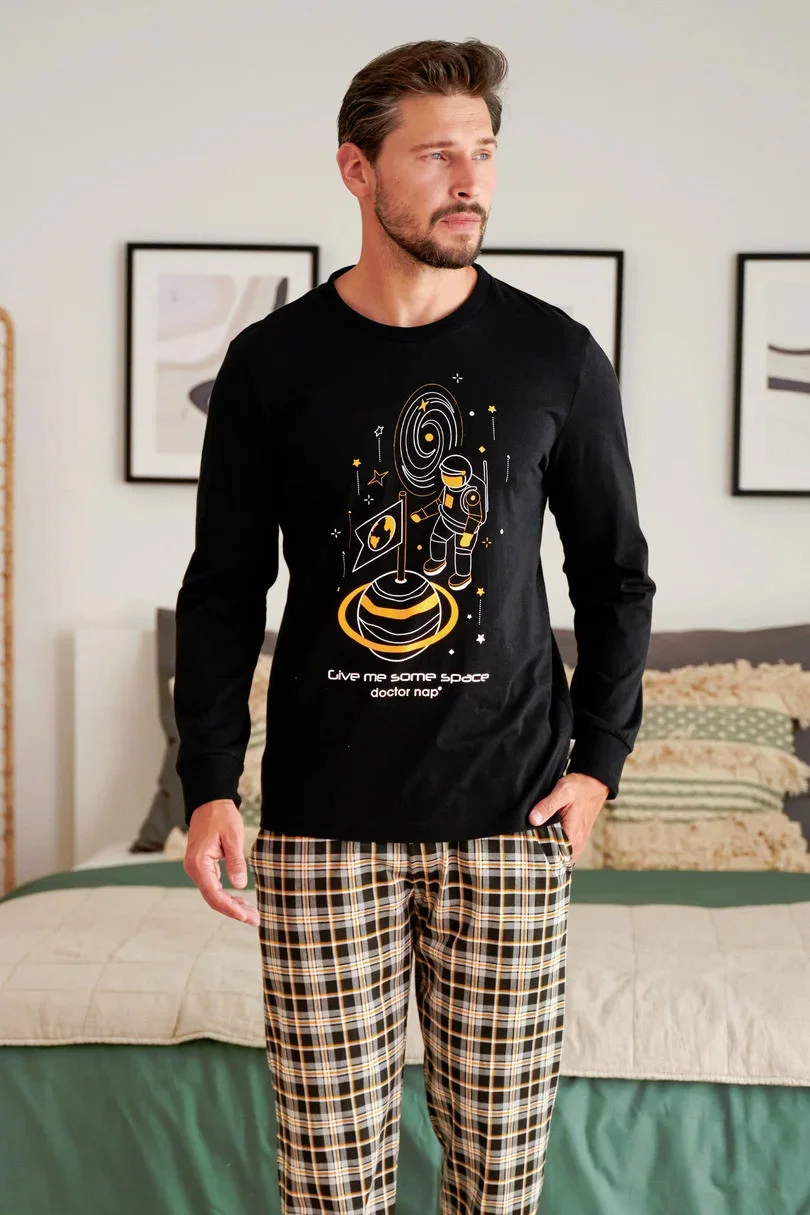 Pánské pyžamo ušité z vysoce kvalitní měkké bavlny. Pruhované tričko s dlouhými rukávy a potiskem na hrudi. Doplňují je dlouhé pevné kalhoty se šňůrkami na nohavicích a kapsami.