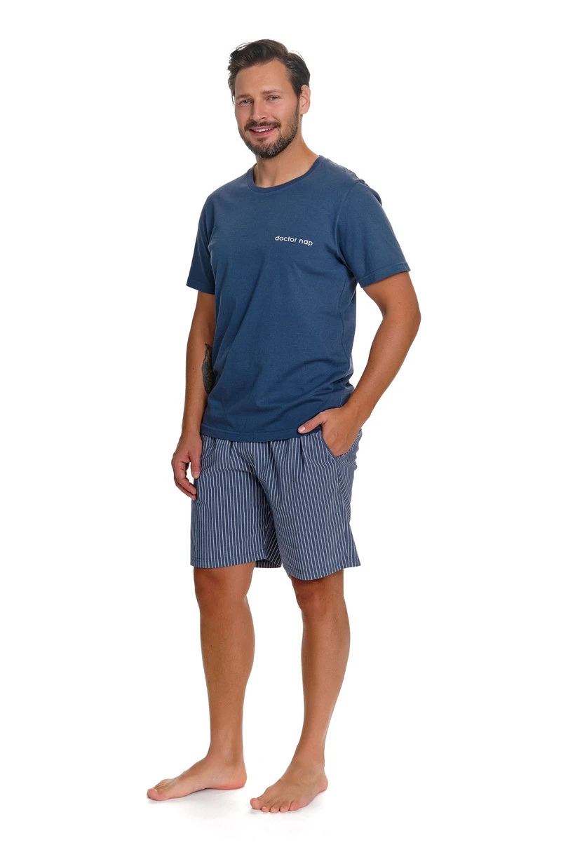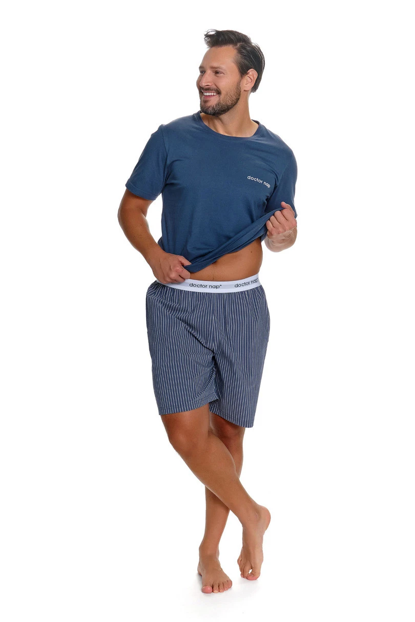 Pánské pyžamo PMB.7424 DR NAP v barvě Denim Blue je klasická, nadčasová souprava určená na spaní a domácí odpočinek. Je vyrobena z vysoce kvalitního úpletu (71 % bavlna, 26 % polyester, 3 % elastan), je měkká a příjemná k pokožce a zajišťuje pohodlí po celou noc. Hladké tričko v barvě Denim Blue s decentním logem Doctor Nap na hrudi má uvolněný, pohodlný střih, zatímco jemně pruhované šortky dodávají soupravě lehce sportovní nádech. Ozdobná guma v pase s logem značky zaručuje dokonalé padnutí a moderní vzhled, zatímco praktické kapsy na bocích zvyšují funkčnost soupravy. Pyžamo bylo pečlivě ušito v Polsku s důrazem na každý detail. Model je k dispozici také v dámské verzi - ideální pro vytvoření rodinné soupravy.