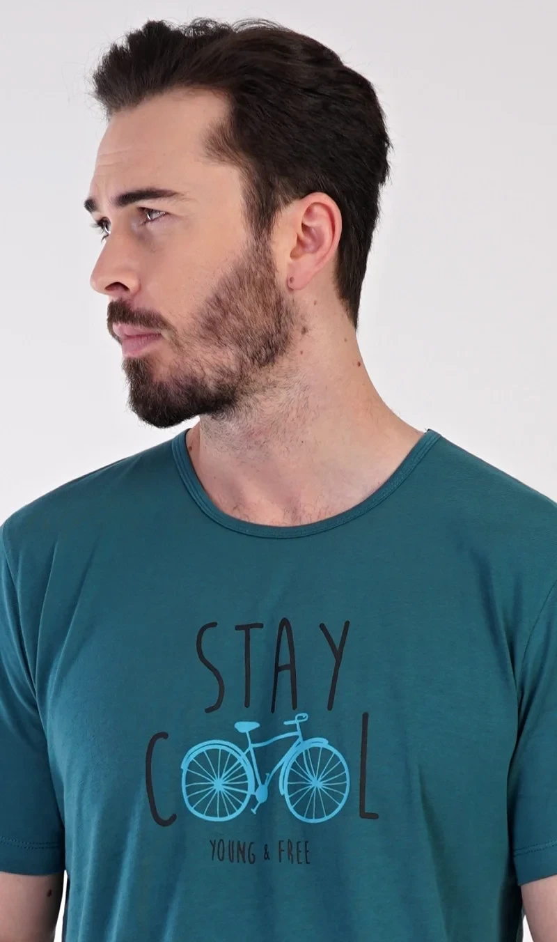 Pánské bavlněné pyžamo šortky Adam. Pánské pyžamo se skládá z trička s krátkým rukávem a krátkých šortkových kalhot. Na tričku je obrázek kola a nápis 'Stay cool, young and free'. Tričko doplňují kárované šortky, které mají v pase gumu a šňůrku na stažení. Nemají kapsy. Použitý materiál s obsahem bavlny 100% je příjemný a poddajný na dotek.