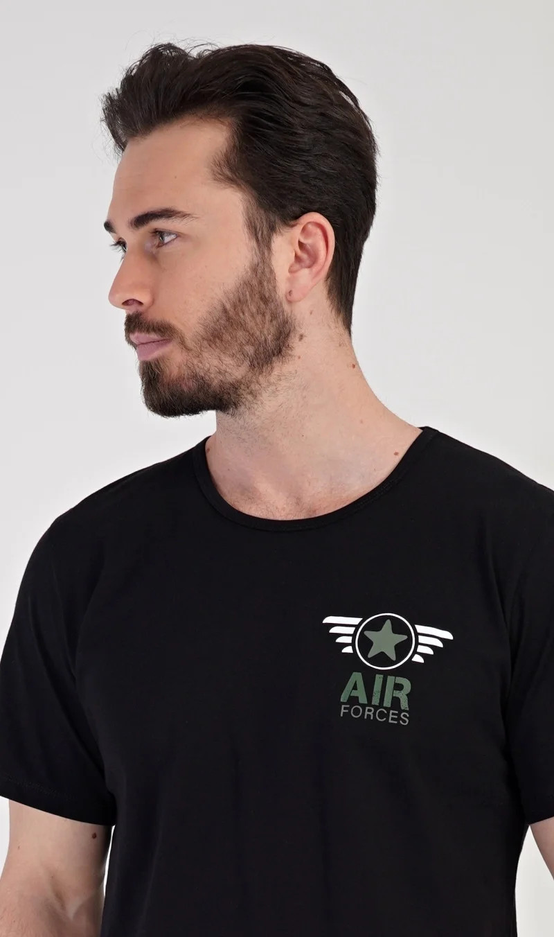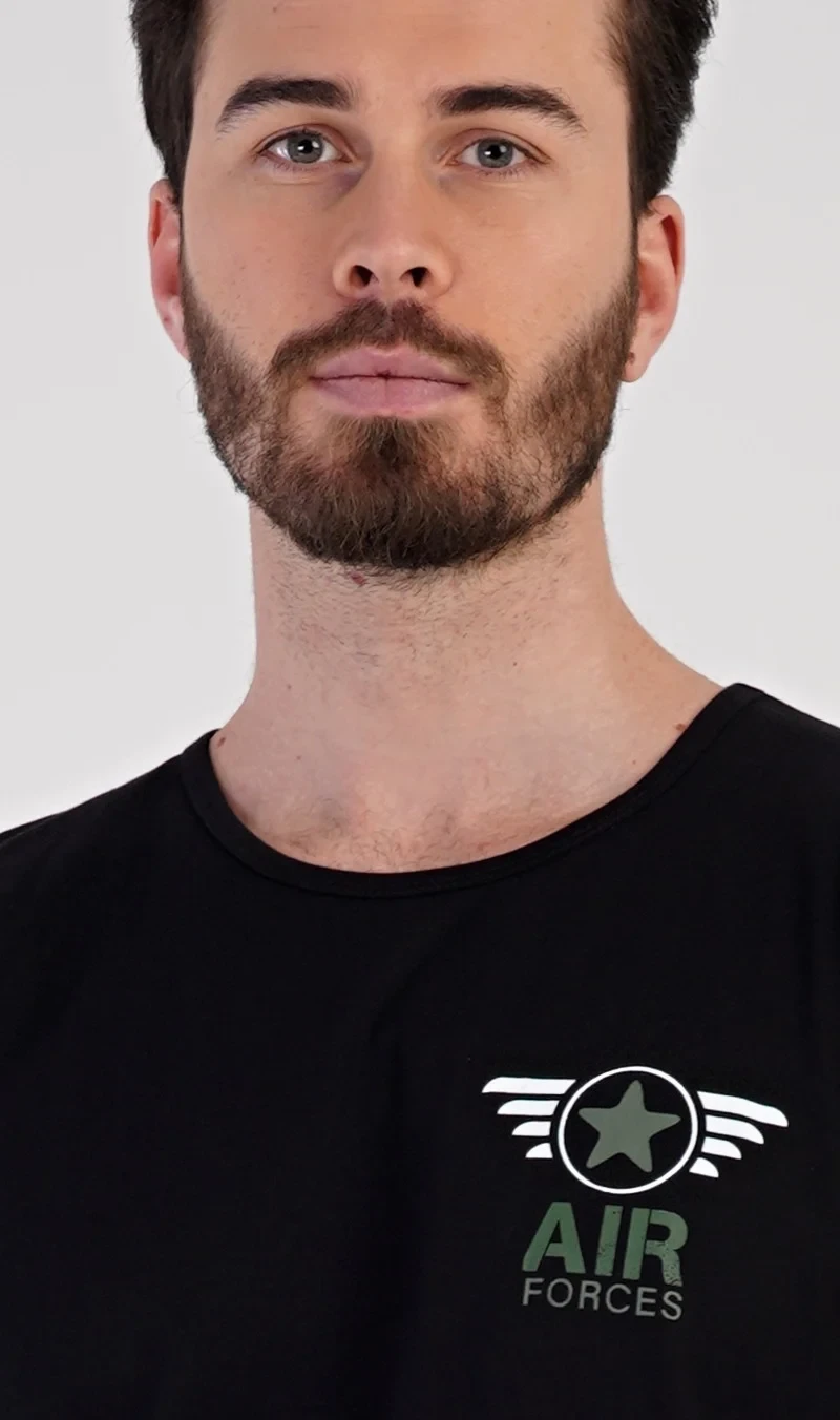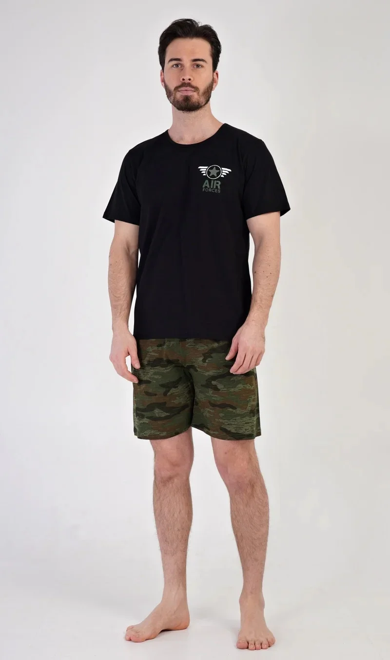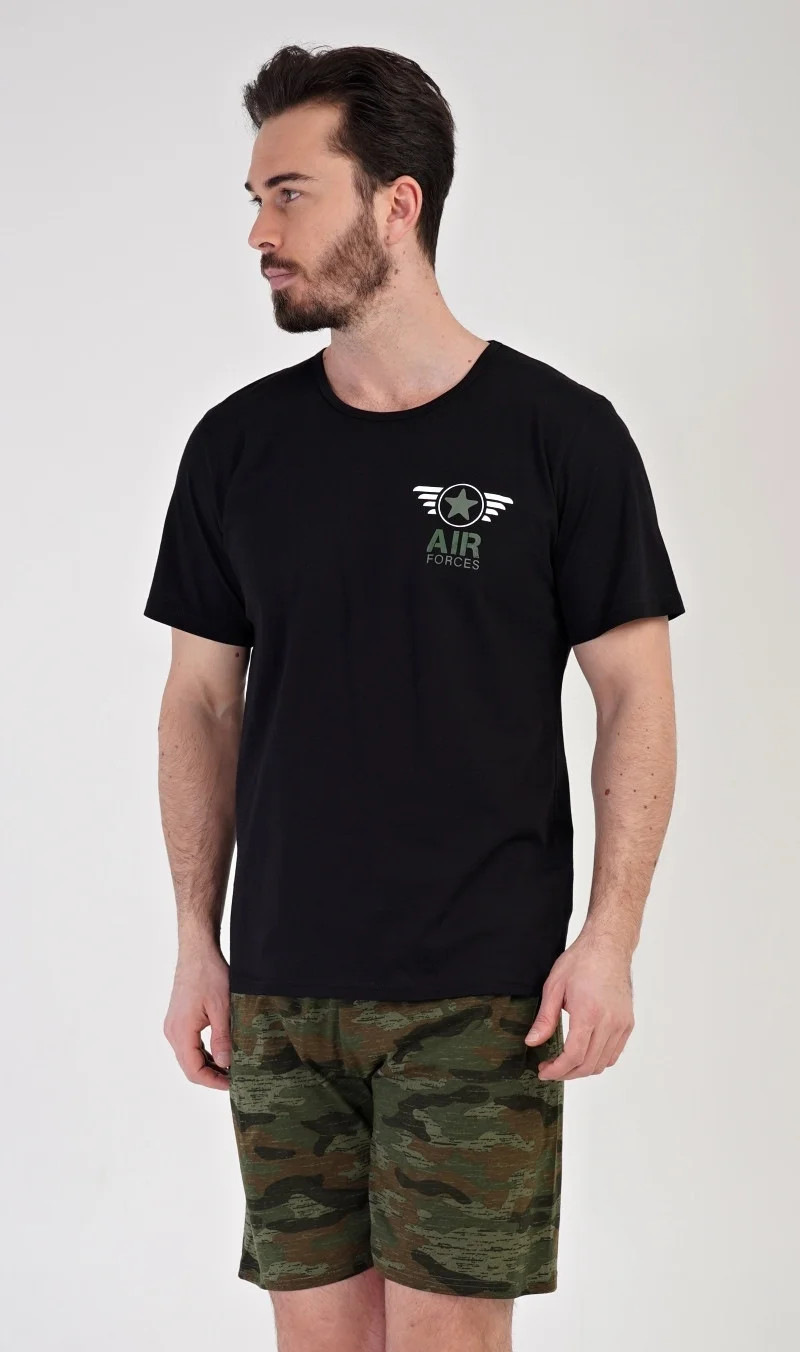 Pánské bavlněné pyžamo šortky Air. Pánské pyžamo se skládá z trička s krátkým rukávem a šortkových kalhot. Černé tričko s kulatým výstřihem zdobí menší nápis. Šortky s army potiskem mají v pase gumu a šňůrku na stažení. Krátké šortkové kalhoty nemají kapsy. Použitý materiál s obsahem bavlny 100% je příjemný a poddajný na dotek.