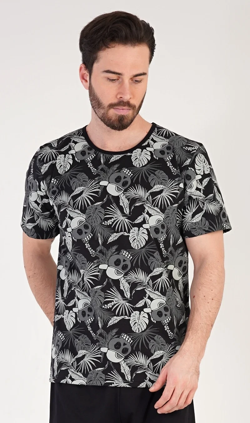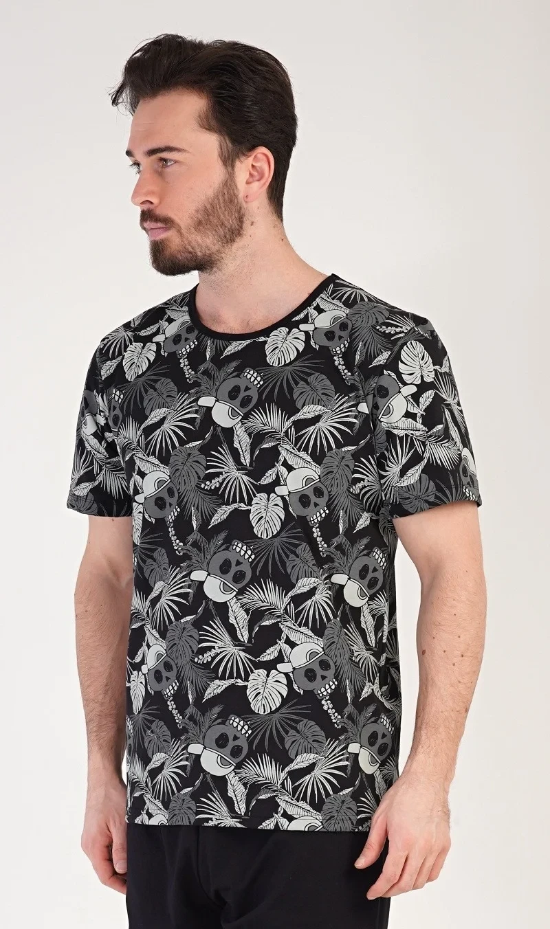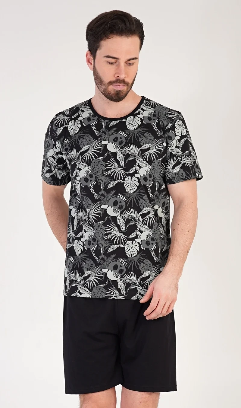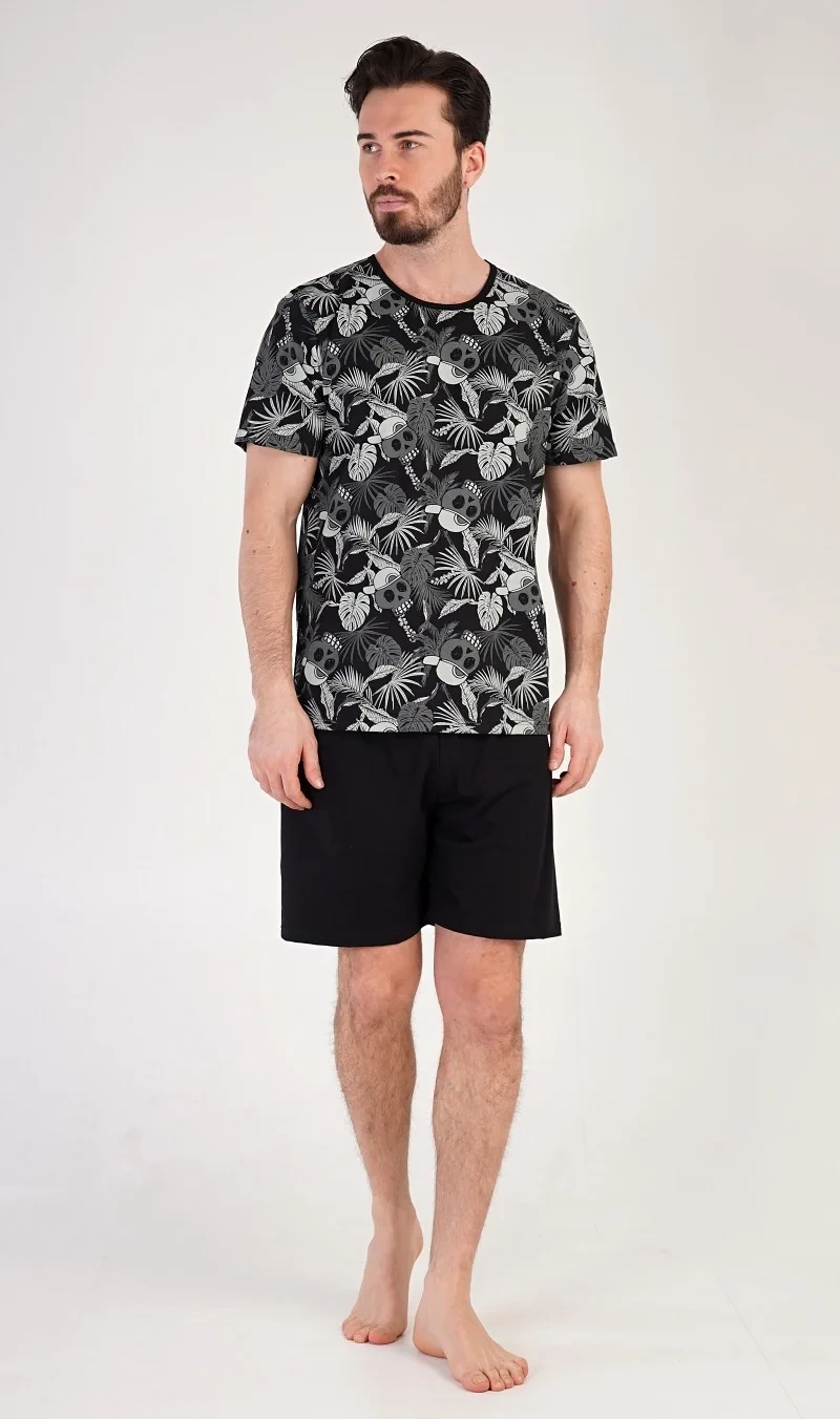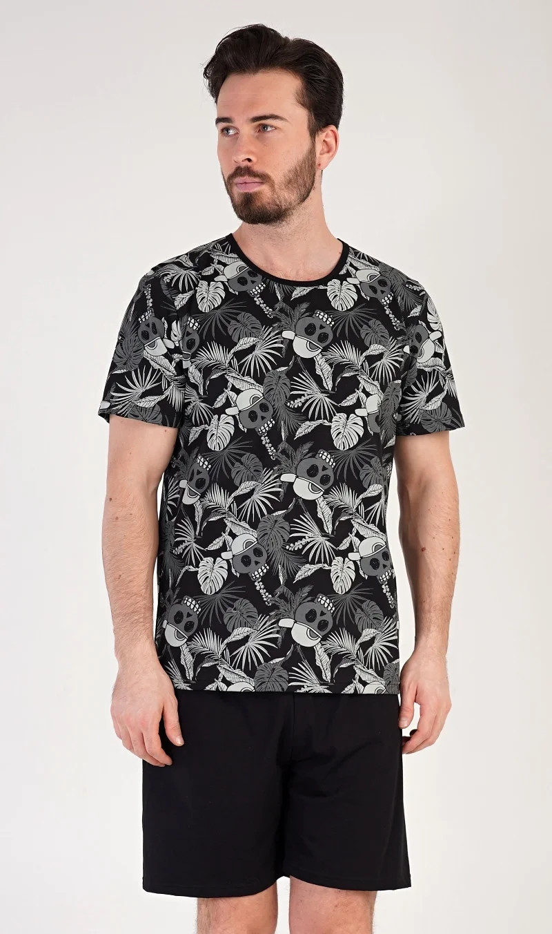 Pánské bavlněné pyžamo šotky Albert. Pánské pyžamo se skládá z trička s krátkým rukávem a krátkých šortkových kalhot. Tričko s kulatým výstřihem je potištěno. Šortky jsou bez kapes, mají gumu a šňůrku na stažení. Použitý materiál s podílem bavlny 100% je příjemný a poddajný na dotek. Pyžamo je vhodné i na denní nošení.