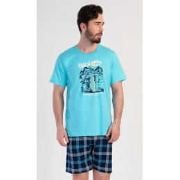 Pánské bavlněné pyžamo šortky California. Pánské pyžamo se skládá z trička s krátkým rukávem a krátkých šortkových kalhot. Na tričku je obrázek obytného auta se surfařským prknem a nápis 'California'. Tričko doplňují kárované šortky, které mají v pase gumu a šňůrku na stažení, nemají kapsy. Použitý materiál s obsahem bavlny 100% je příjemný a poddajný na dotek.