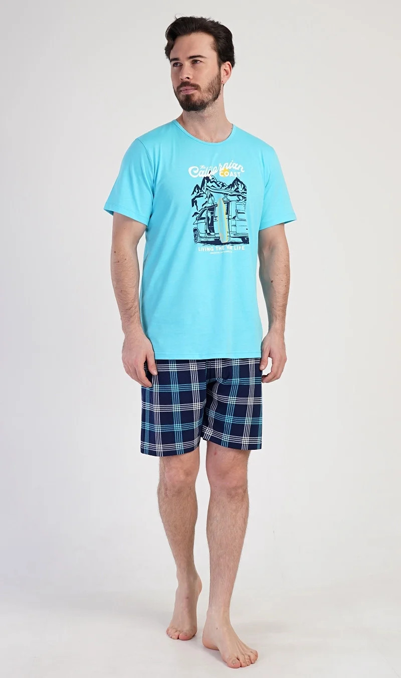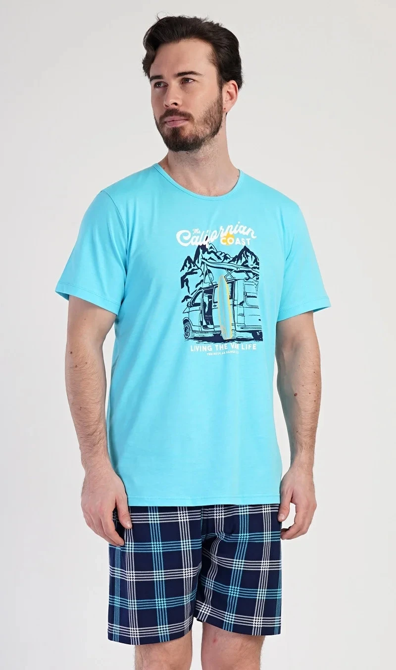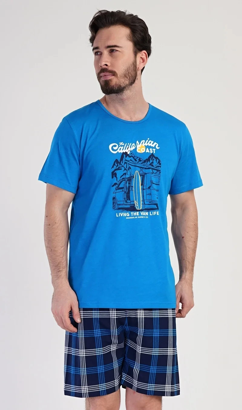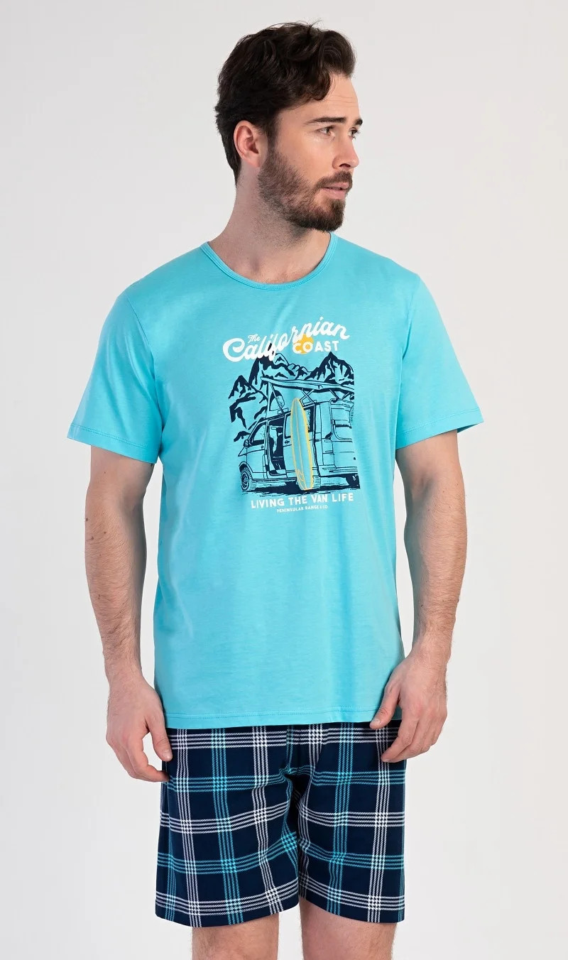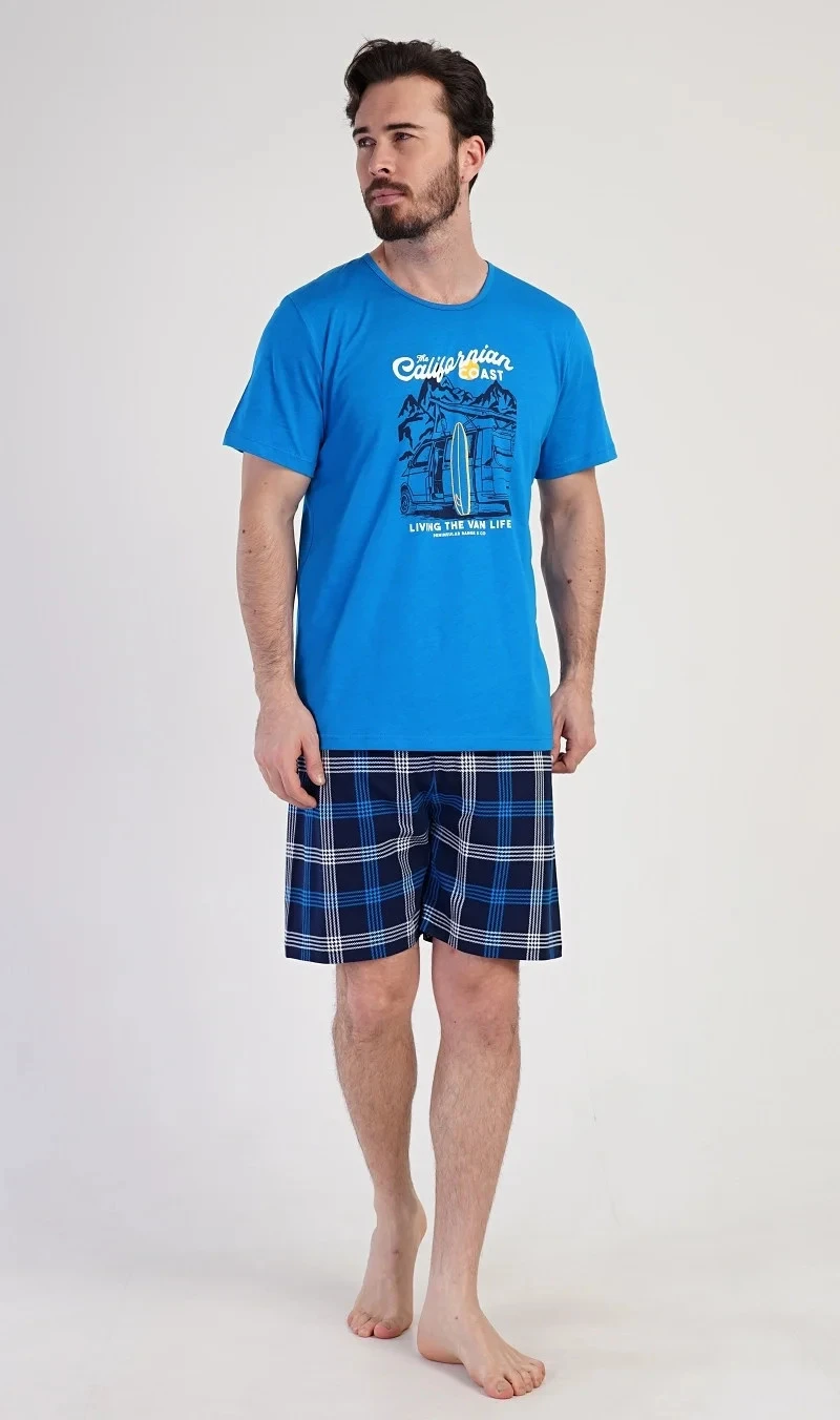 Pánské bavlněné pyžamo šortky California. Pánské pyžamo se skládá z trička s krátkým rukávem a krátkých šortkových kalhot. Na tričku je obrázek obytného auta se surfařským prknem a nápis 'California'. Tričko doplňují kárované šortky, které mají v pase gumu a šňůrku na stažení, nemají kapsy. Použitý materiál s obsahem bavlny 100% je příjemný a poddajný na dotek.