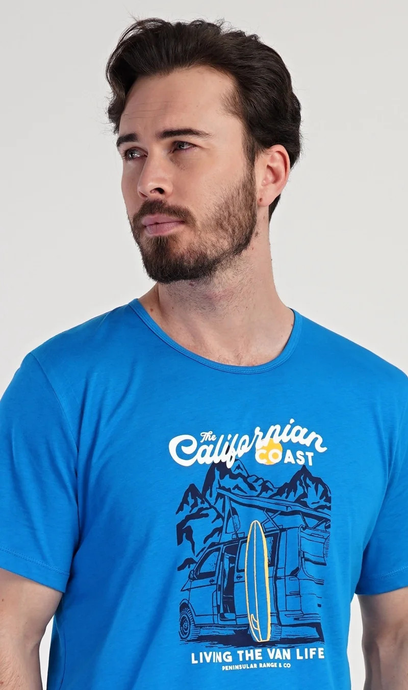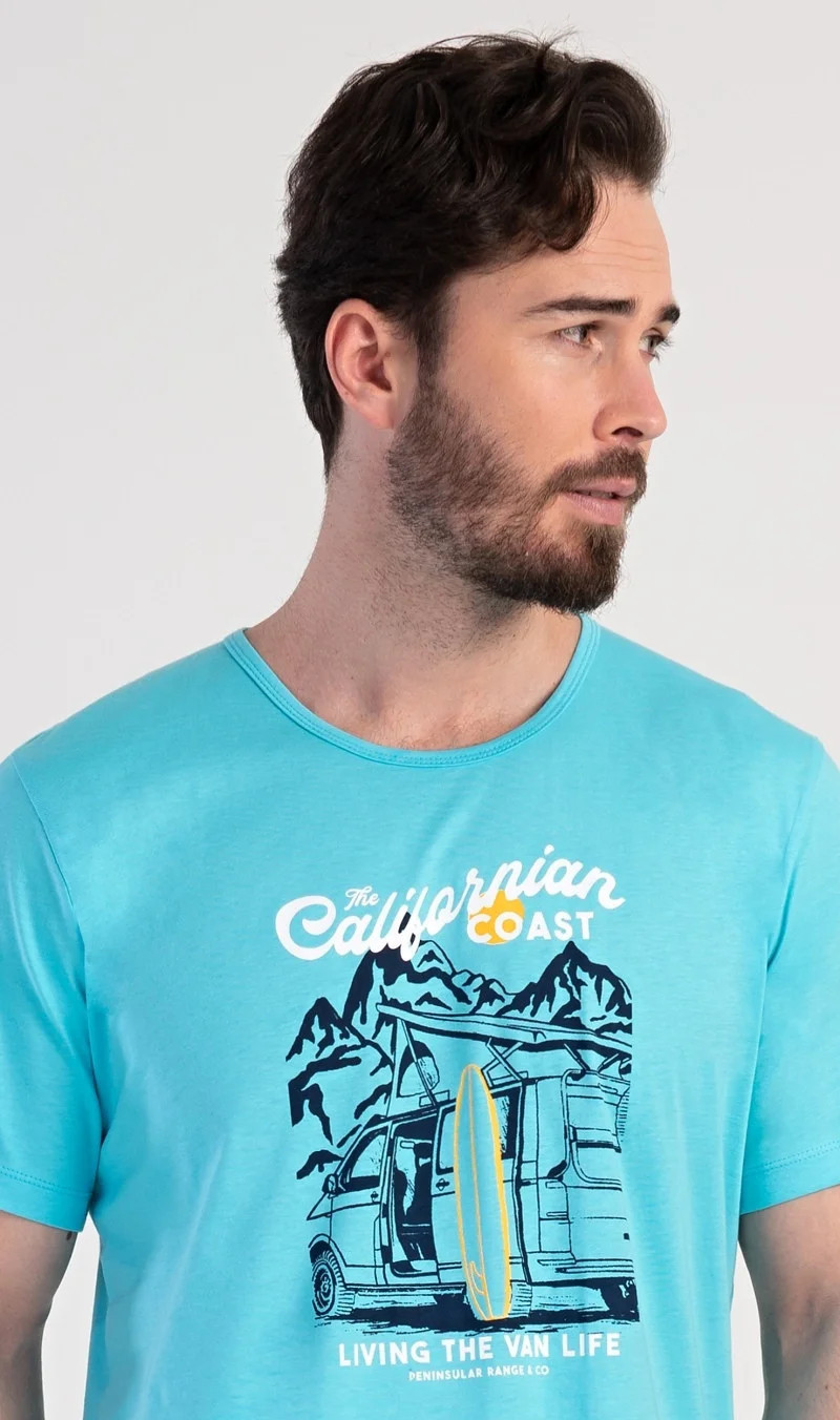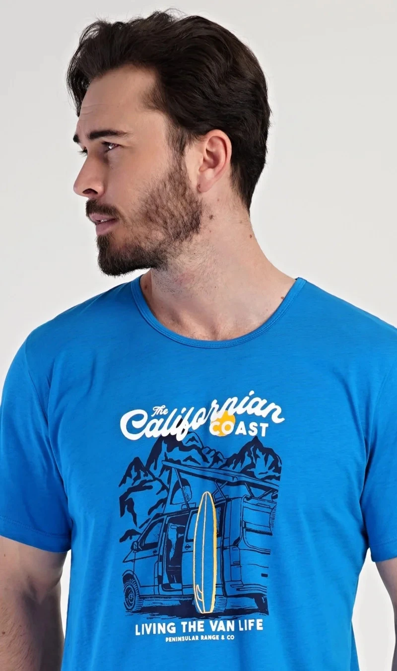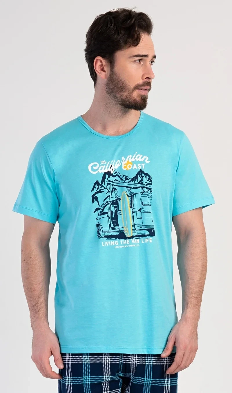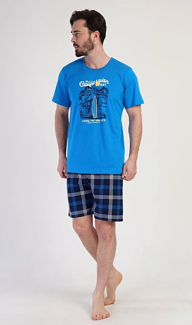 Pánské bavlněné pyžamo šortky California. Pánské pyžamo se skládá z trička s krátkým rukávem a krátkých šortkových kalhot. Na tričku je obrázek obytného auta se surfařským prknem a nápis 'California'. Tričko doplňují kárované šortky, které mají v pase gumu a šňůrku na stažení, nemají kapsy. Použitý materiál s obsahem bavlny 100% je příjemný a poddajný na dotek.