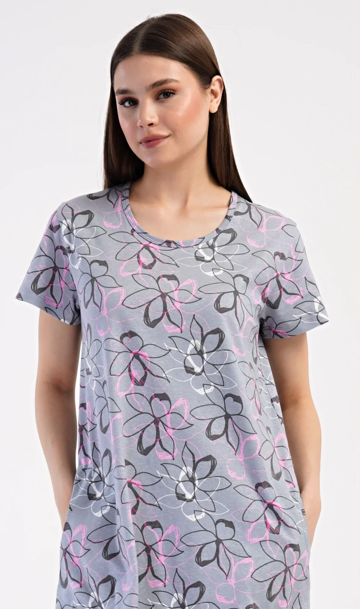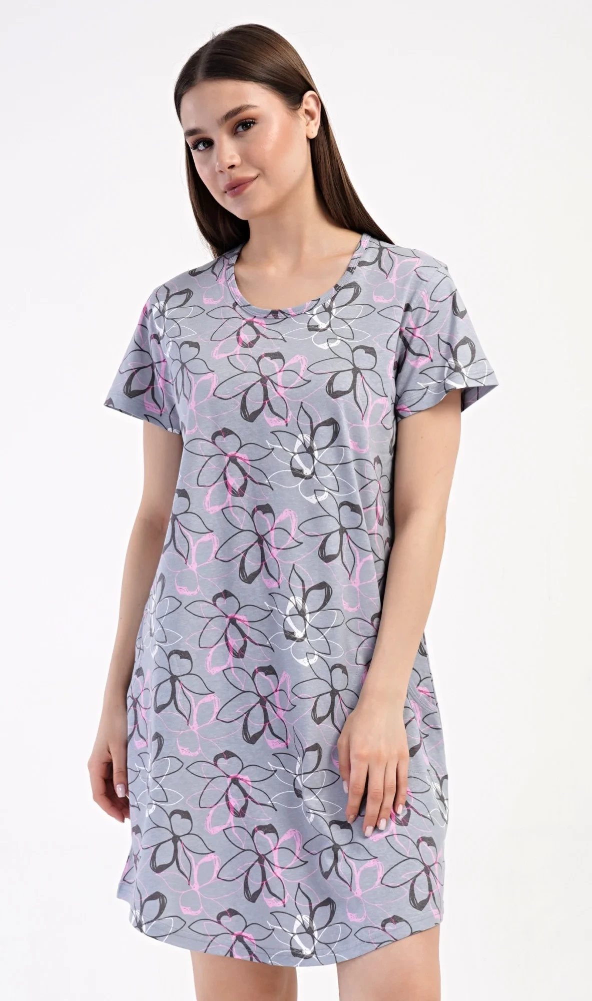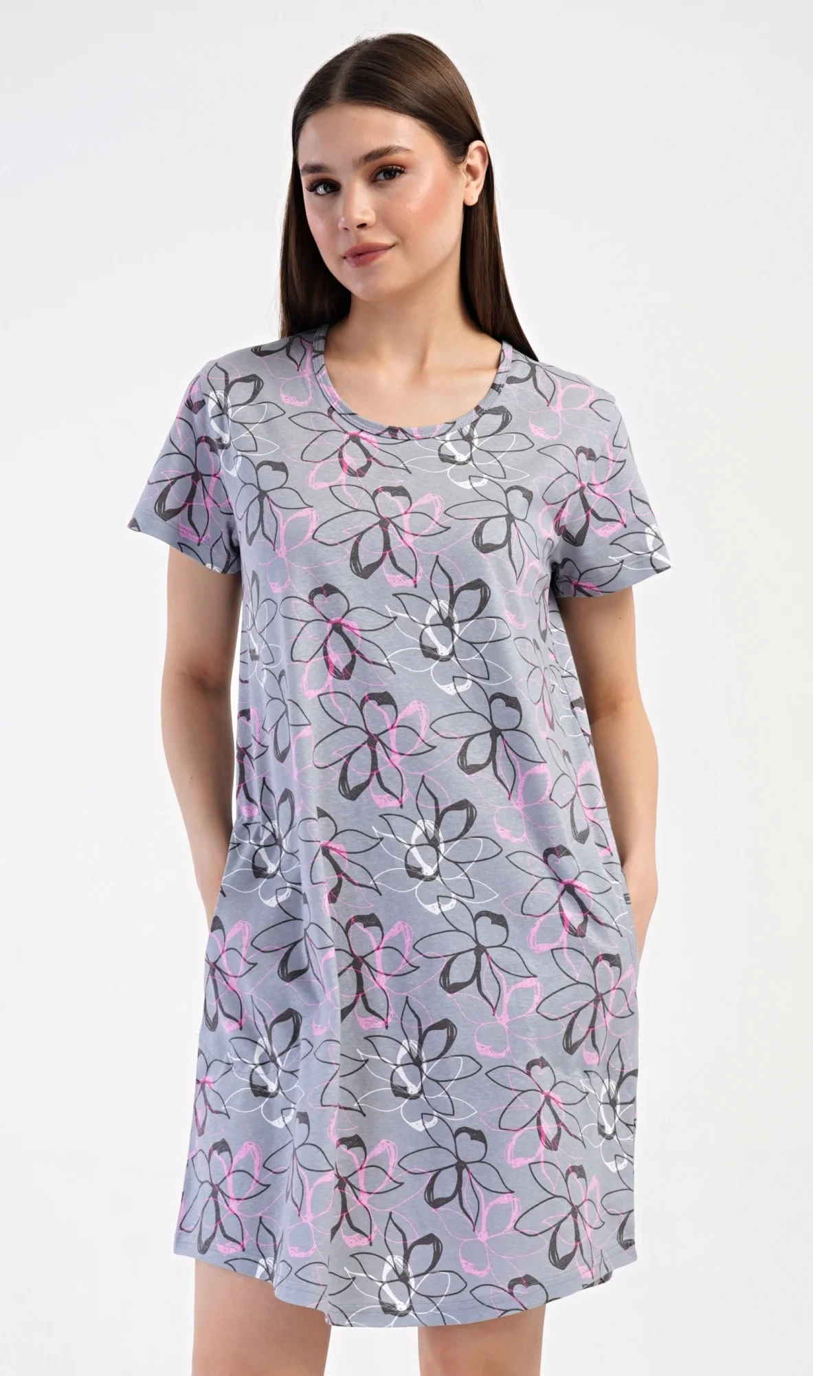 Dámské bavlněné domácí šaty s krátkým rukávem Mia. Domácí jednobarevné šaty s kulatým výstřihem a kapsami zdobí květy. Použitý bavlněný materiál je příjemný a poddajný na dotek. Šaty jsou pohodlné, vhodné na spaní i na denní nošení.