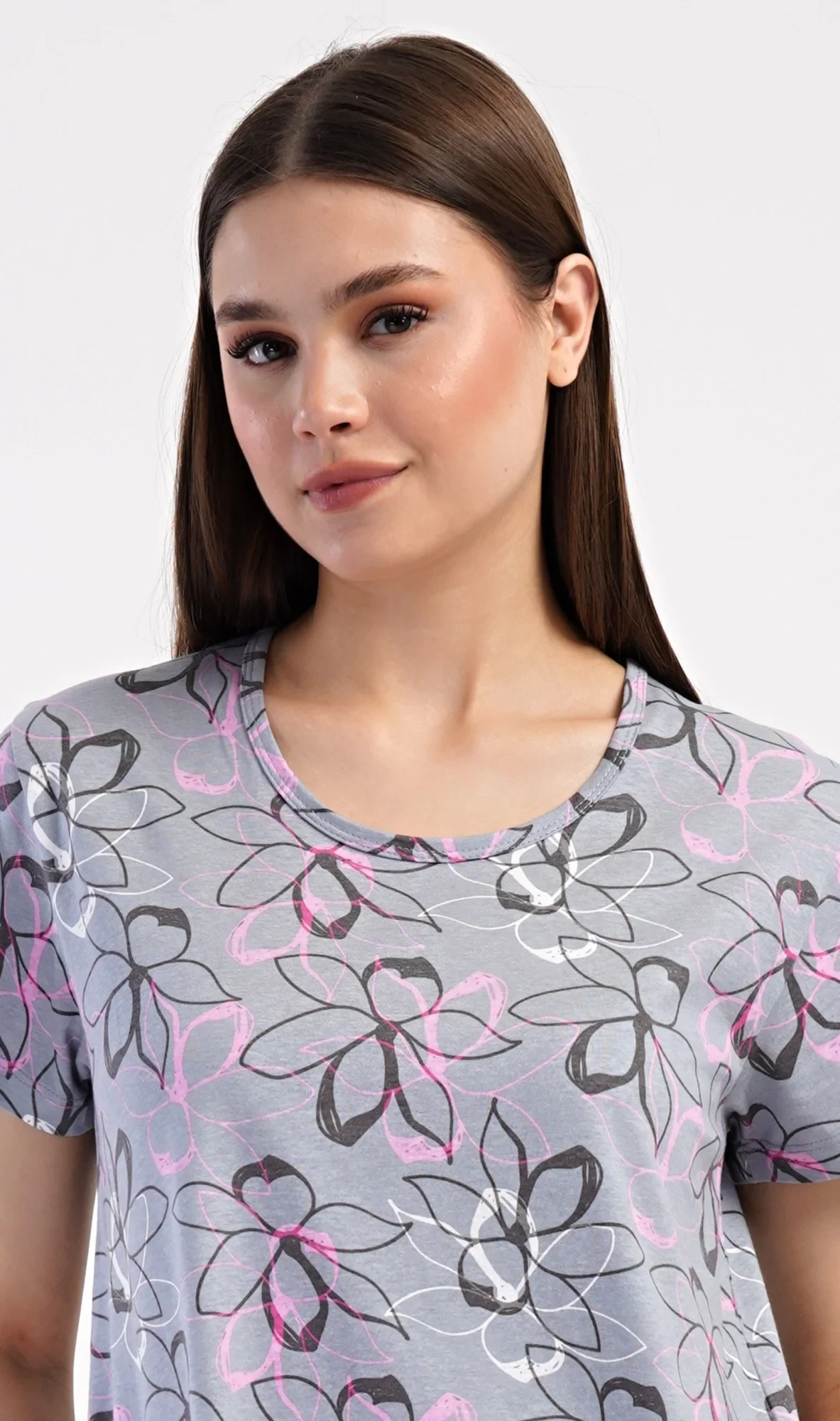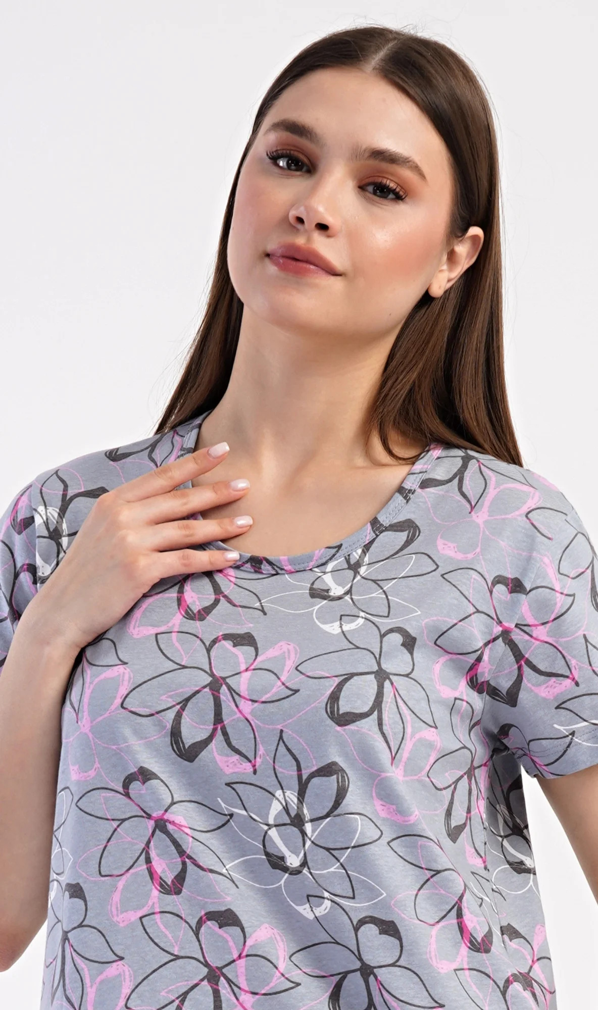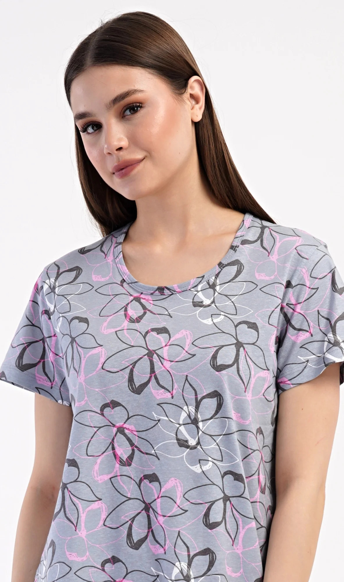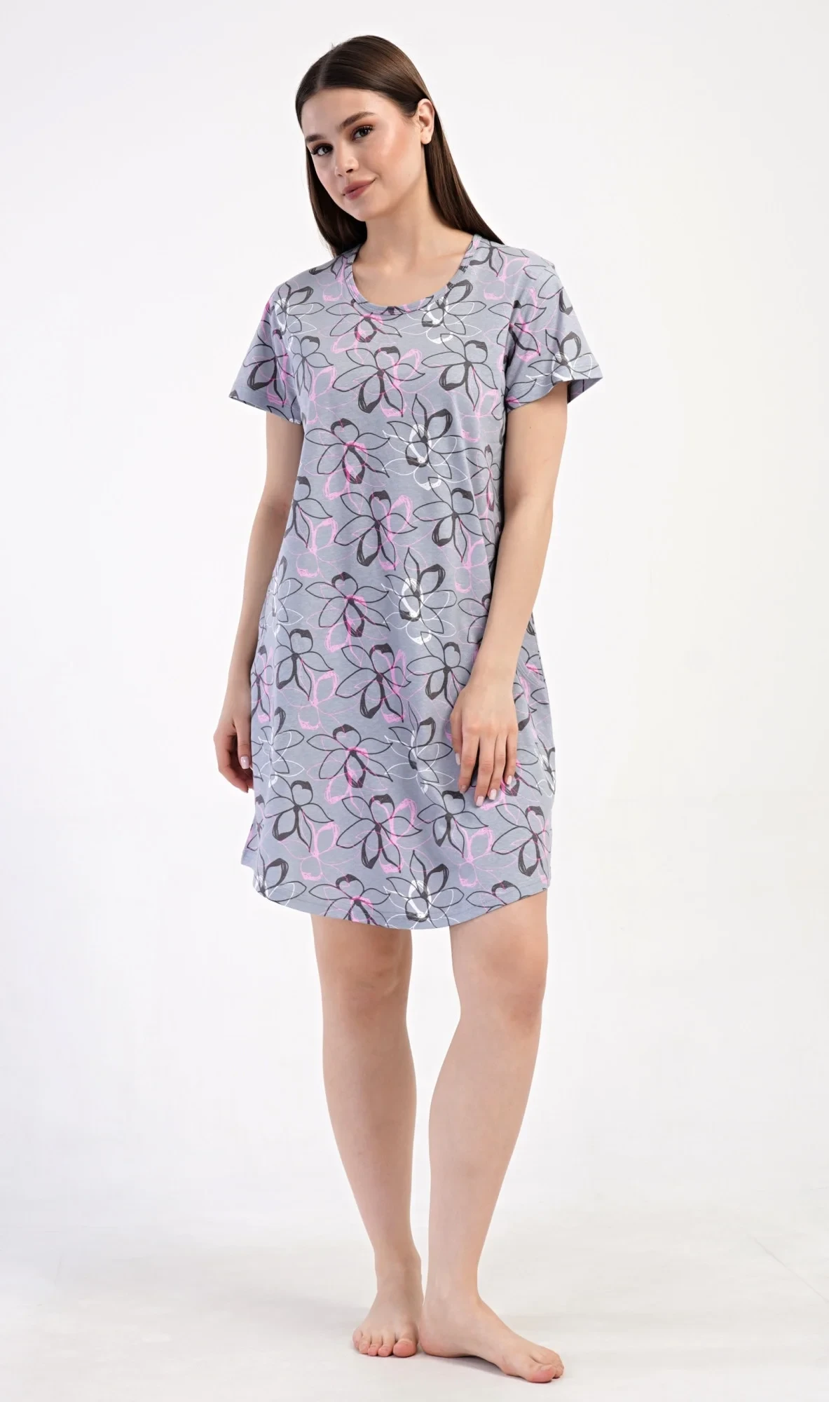 Dámské bavlněné domácí šaty s krátkým rukávem Mia. Domácí jednobarevné šaty s kulatým výstřihem a kapsami zdobí květy. Použitý bavlněný materiál je příjemný a poddajný na dotek. Šaty jsou pohodlné, vhodné na spaní i na denní nošení.